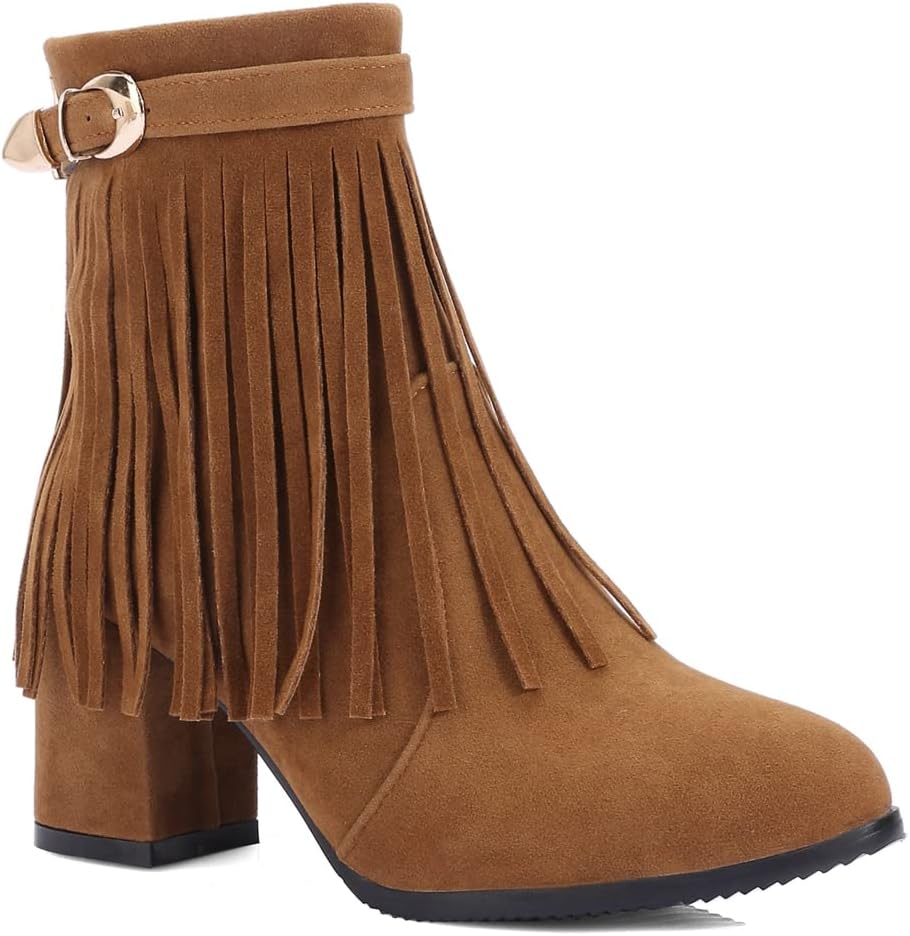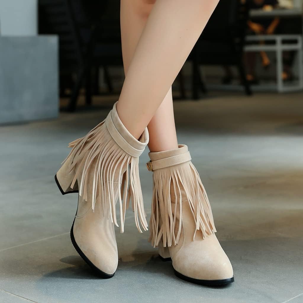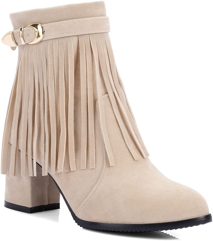 Women's Fringed Tassel Dress Ankle Boots Round Toe Buckle Zipper Chunky Block High Heel Short BootiesSize Chart:Size 4 US = EU34 = Heel to Toe 22.0cm/8.66"Size 4.5 US = EU35 =Heel to Toe 22.5cm/8.86"Size 5 US = EU36 = Heel to Toe 23cm/9.06"Size 6 US = EU37 = Heel to Toe 23.5cm/9.25"Size 7 US = EU38 = Heel to Toe 24cm/9.45"Size 8 US = EU39 = Heel to Toe 24.5cm/9.65"Size 8.5 US = EU40 = Heel to Toe 25cm/9.84"Size 9 US = EU41 = Heel to Toe 25.5cm/10.04"Size 10 US = EU42 = Heel to Toe 26cm/10.24"Size 11 US = EU43 = Heel to Toe 26.5cm/10.43"Use your length and width measurements to find your shoe size on the above size chart. If your foot is fat or wide, please select a bigger size up.PERFECT ITEM FEATURES:☛Item Type: Ankle-boots☛Main Material: High Quality Suede Leather upper; Comfort Velvet Lining; Non-skid Rubber sole.☛Closure_type: Side Zipper☛toe_style: Round-toe☛Heel Height: Heel Height 3.15 inch☛Width: Medium (BM)☛Season: Spring/Autumn/Winter☛Color: Multiple colors optional☛Occasion Lifestyle: Fashion,Classic,Casual.☛ ☛