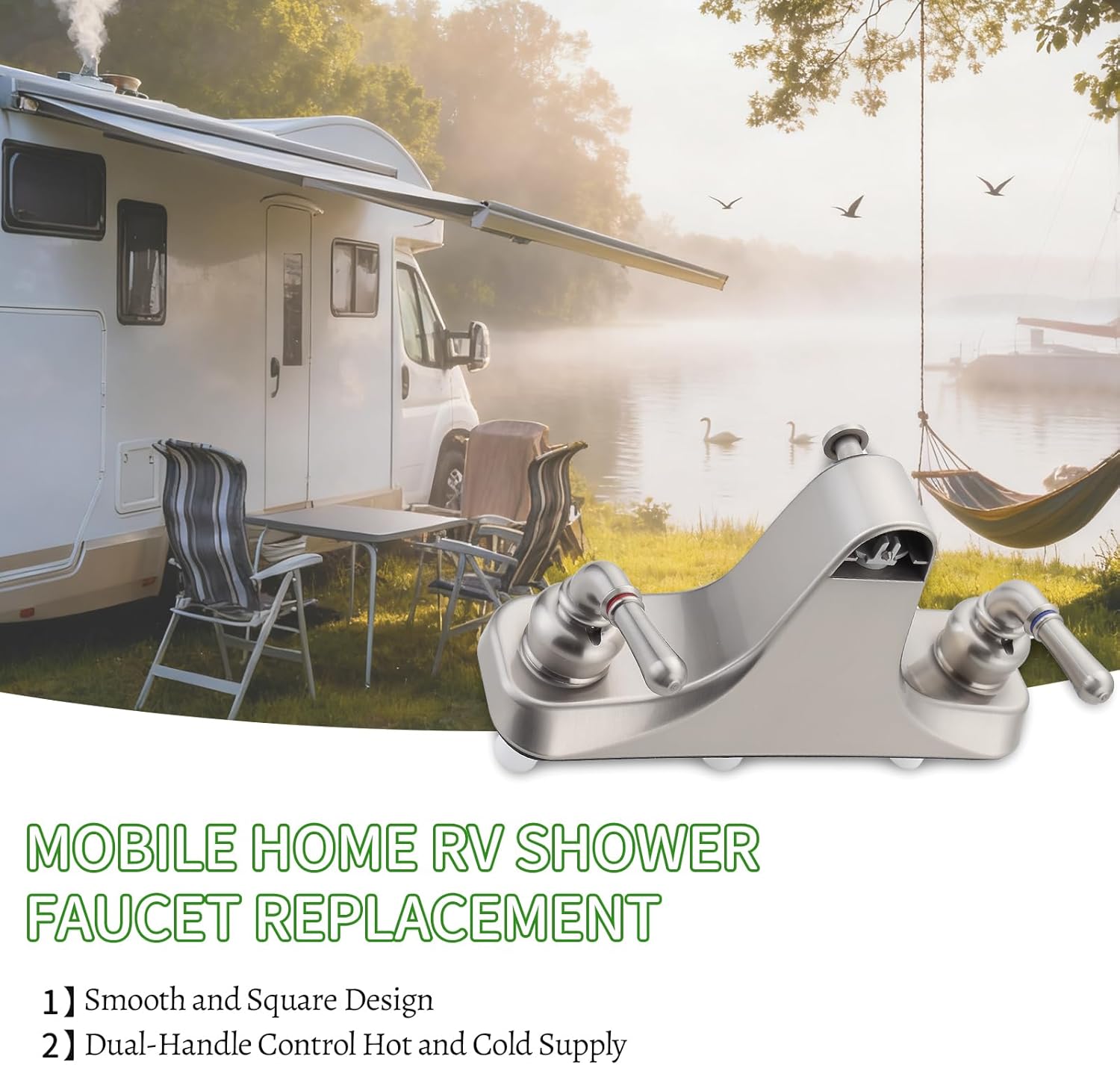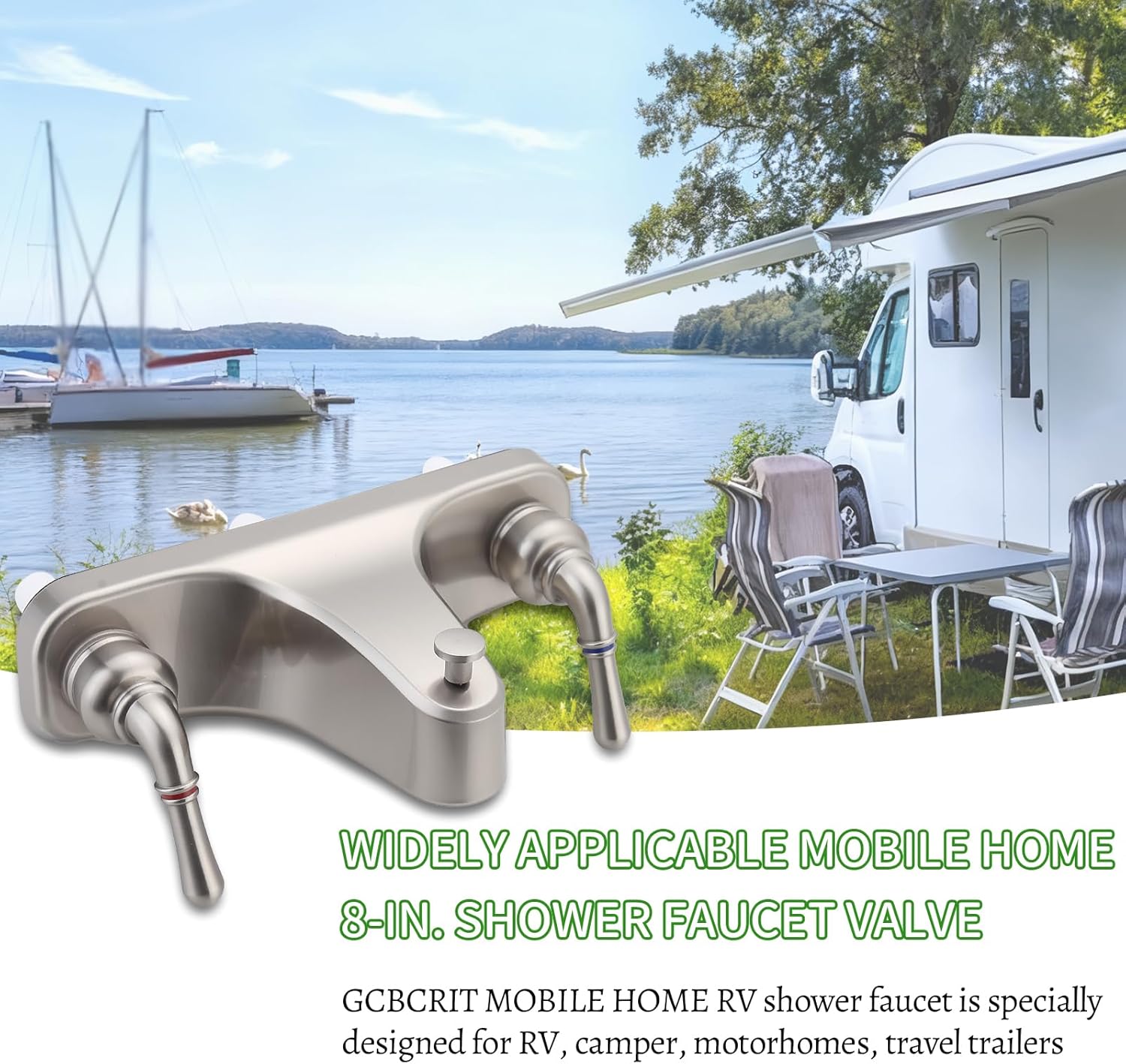 Mobile Home RV Tub Shower Center-Set Faucet, 8 inch, 2-Handle Wall Mount Shower Valve, RV and Motor Home Bath Tub & Shower Faucet with Clear Acrylic Knobs Product Name: Mobile Home RV Tub Shower Center-Set FaucetProduct Colors: Brushed Nickel, Chrome, Matte BlackSuitable Scenarios: 8-inch dual-handle bathtub and shower faucet for mobile homesThe water connections are set 8 inches apart, and the width between the outer connections and the middle connection is 4 inches.Designed specifically for the plumbing standards of mobile homes and RVs, ensuring a hassle-free installation process.The handle is made of acrylic material with a clear, crystal-like shine. Its rounded, wide shape is not only modern and aesthetically pleasing but also provides a comfortable grip, allowing for easy operation even with wet hands.