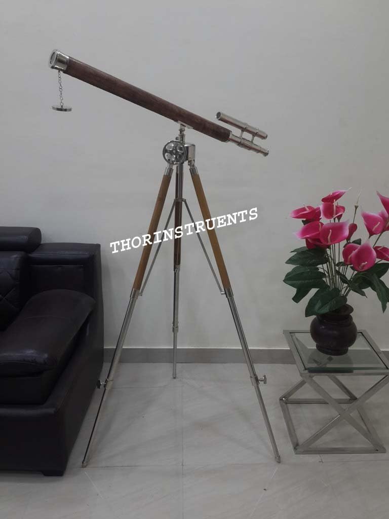 A Unique Brass double barrel covered with brown Leather telescope with adjustable wooden steel tripod stand and classy Chrome finish Interior working & decorative Item.This telescope is a fully functioning nautical masterpiece that adds class and sophistication to any room. This is a perfect as a gift,