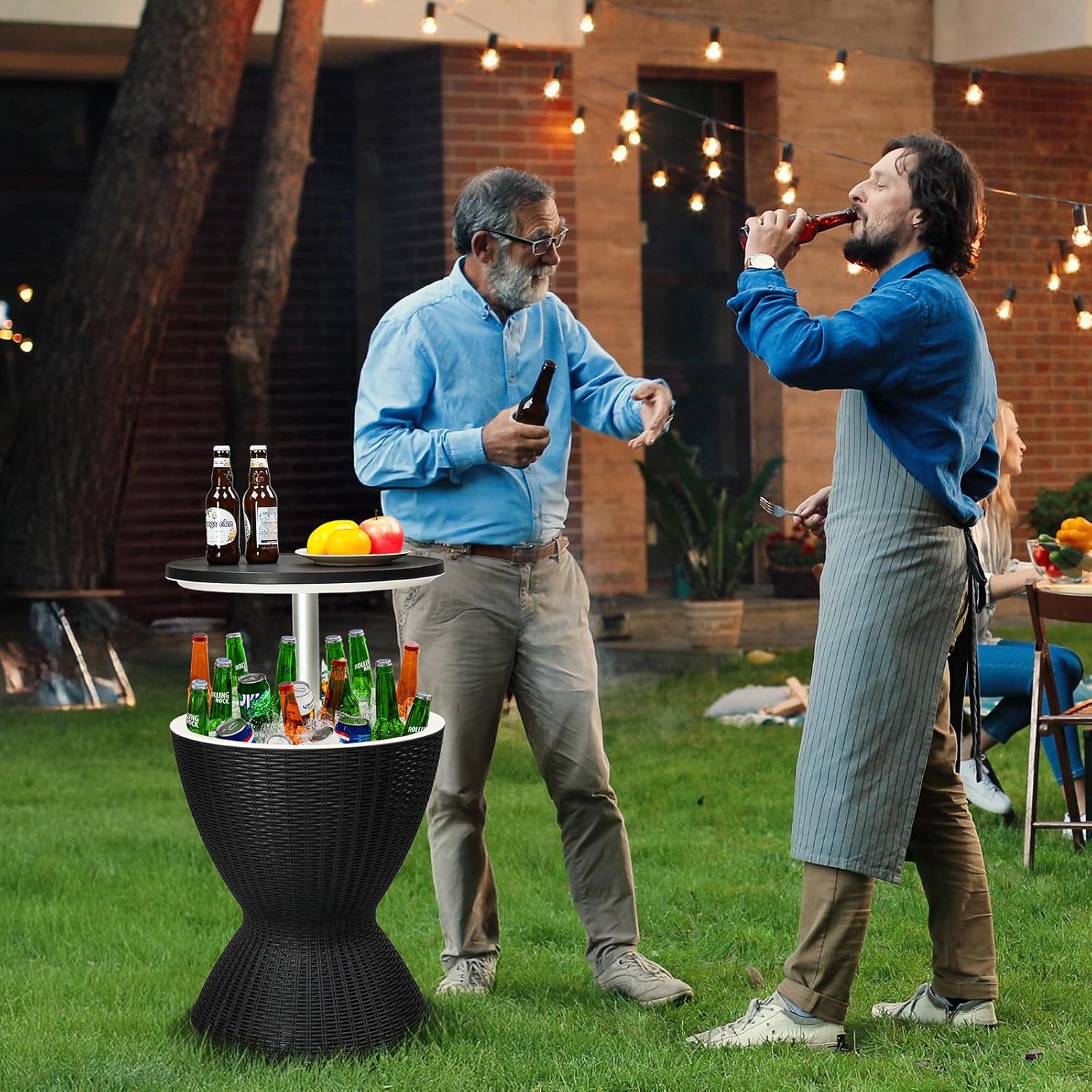 Outdoor Bar Table: Elevate Your Party Experience. This portable bar table allows your guests to enjoy chilled drinks without being far from any activitiesPop-up Bar and Concealed Cooler: Features a retractable lid design that lifts up 10 inches. Concealed 8-gallon cooler at the bottom:Keeps up to 50 12-ounce canned drinks chilled,Additionally, the double-insulated wall design provides excellent insulation, keeping drinks ice-cold for up to 12 hoursAll-weather Resistance: The thick exterior resin prevents rusting, peeling, and denting in all weather conditions (rain or shine), ensuring stability and longevity. Easy Cleanup: The bottom of the cooler has a drain plug, so after the party is over, simply remove the plug to empty the cooler, let it dry, and store it until next useVersatile Use:when not being used as a party bar, the top can be closed and it can be used as a patio coffee table. When raised, its height is perfect for use as a bar table, so you'll always have a place to put your drinks, snacks, and phoneSpecifications:1. Dimension: 19.09"Dia x 32.48"H2. Weight Capacity: 165 lbs /80kg3. Material: PP4. Net Weight: 11.46 lbs / 5.2kgPackage Includes:1 x Cooler Table