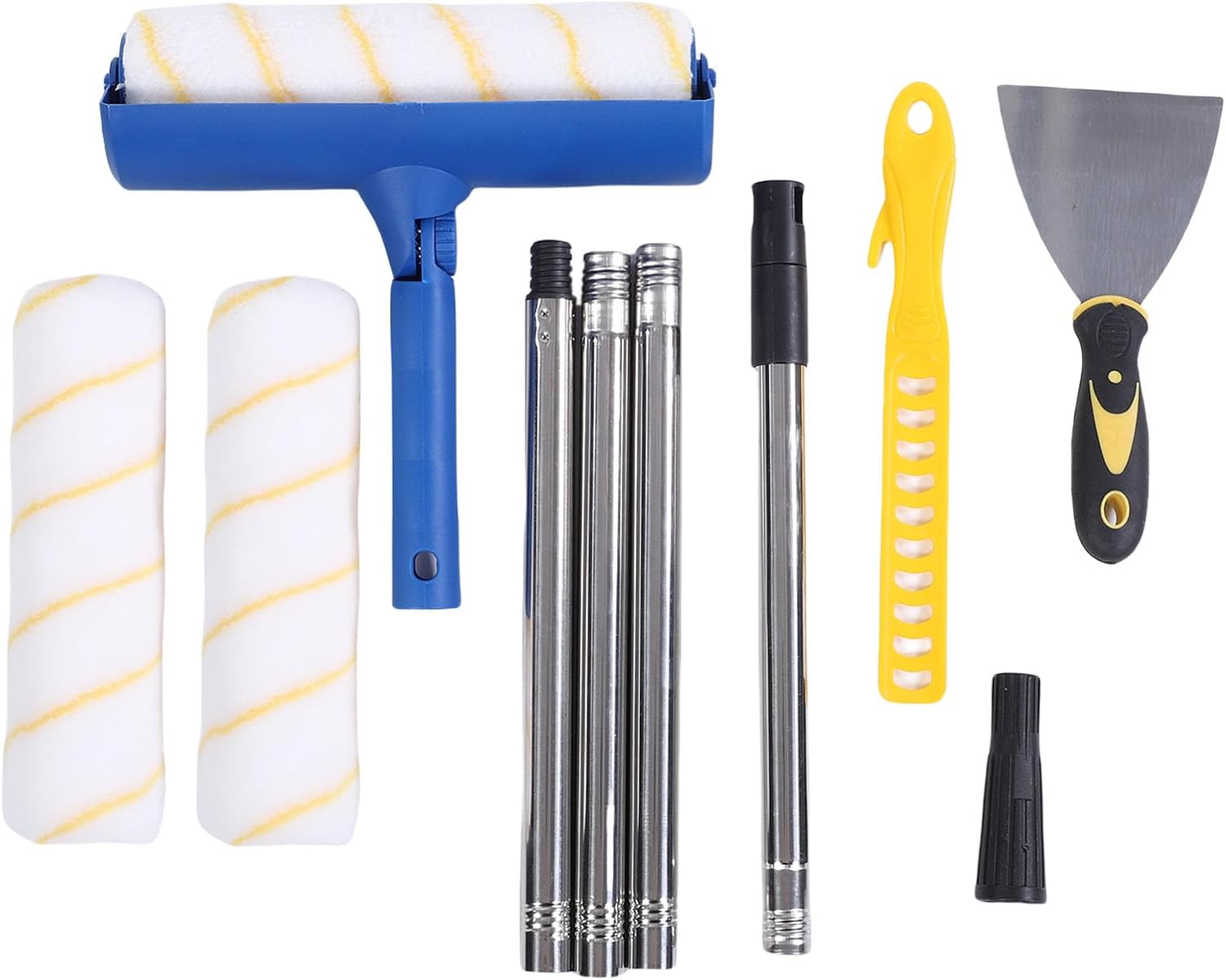 [Smooth Paint Application] The 10-inch paint roller with plastic handle ensures optimal coverage, making painting quick and efficient. [Consistent Finish] The roller brush provides a smooth and even paint finish, with two spare brush covers for easy replacement. [Easy Ceiling Access] This paint roller kit includes four stainless steel extension poles for effortless to high ceilings and tricky areas. [Versatile Usage] Ideal for indoor and outdoor tasks, this paint roller kit is great for ceilings, walls, furniture, and more. [Mess-k> Painting] The -proof design keeps your during painting, for suspended ceilings. Spec: Item Type: Paint Roller Kit Material: ABS, Stainless Steel, Polyester Weight: Approx. 620g / 21.9oz Paint Roller Size: 25.4cm / 10in Package List: 1 x Roller Brush 2 x Brush Cover 4 x Extension Pole 1 x Scraper 1 x Connector 1 x Yellow Accessory