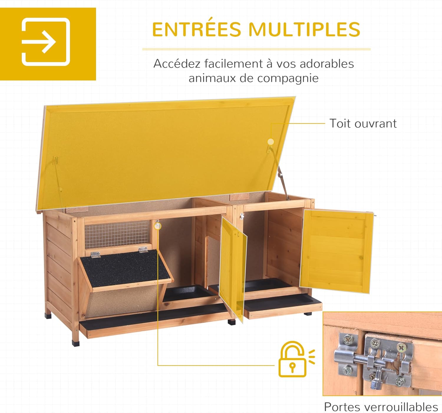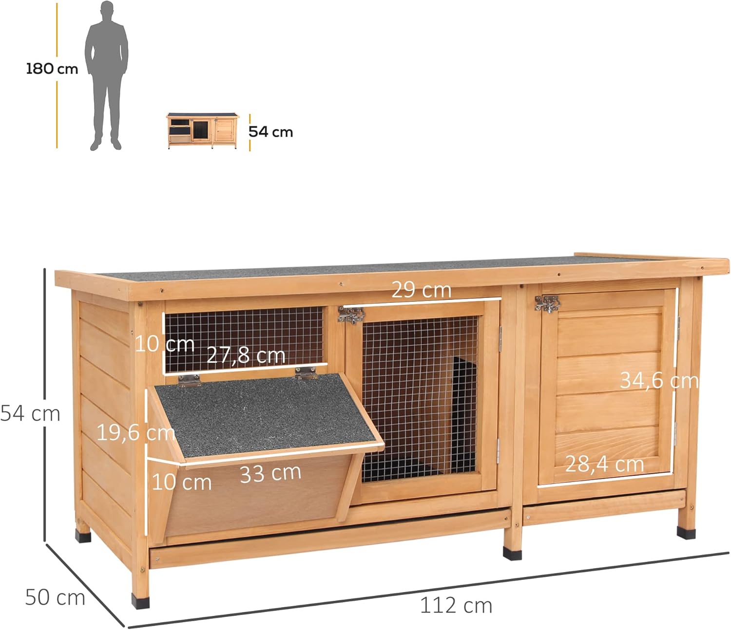 Description: This stunning free standing rabbit hutch from PawHut has a secure, half-open and half-enclosed space ideal for your rabbits to grow in peace and comfort. Equipped with a sliding poop tray, 2 lockable doors, a mesh open space, a feeder, and a sunroof, it will be a pleasure to see your rabbits evolve and flourish! Features: ● Offer a large living space (half-open space half-closed with mesh window) for the greatest comfort of your rabbit ● Numerous equipment: hutch on feet, niche with large entrances, sliding tray with droppings, lockable doors, sunroof, feeder, etc... ● 2 sliding poop drawers and sunroof: easy maintenance of the hutch for the well-being of your pet ● Corrosion resistant mesh cage: ventilation, optimal monitoring ● Assembly required (an illustrated assembly manual provided) Specifications: ● Main colors: natural wood, black ● Main material: fir wood ● Dim. Total : 112L x 50W x 54H cm ● Dim. Internal niche: 107L x 41W x 45H cm. ● Dim. Wooden door: 28.4L x 34.6W cm ● Dim. Grilled door: 29L x 34.6L cm ● Dim. Grilled window: 27.8L x 10W cm ● Dim. Feeder: 33L x 10W cm ● Dim. Waste drawers: 65.9L x 40.5W cm, 34.5L x 40.5W cm ● Delivery: in one package ● Ref: D51-132YL ● Note: Please determine the number of animals according to the size of the hutch ● Possibility of taking back your old product according to our GTC. Package includes: 1 x Rabbit Cage; 1 x Manual