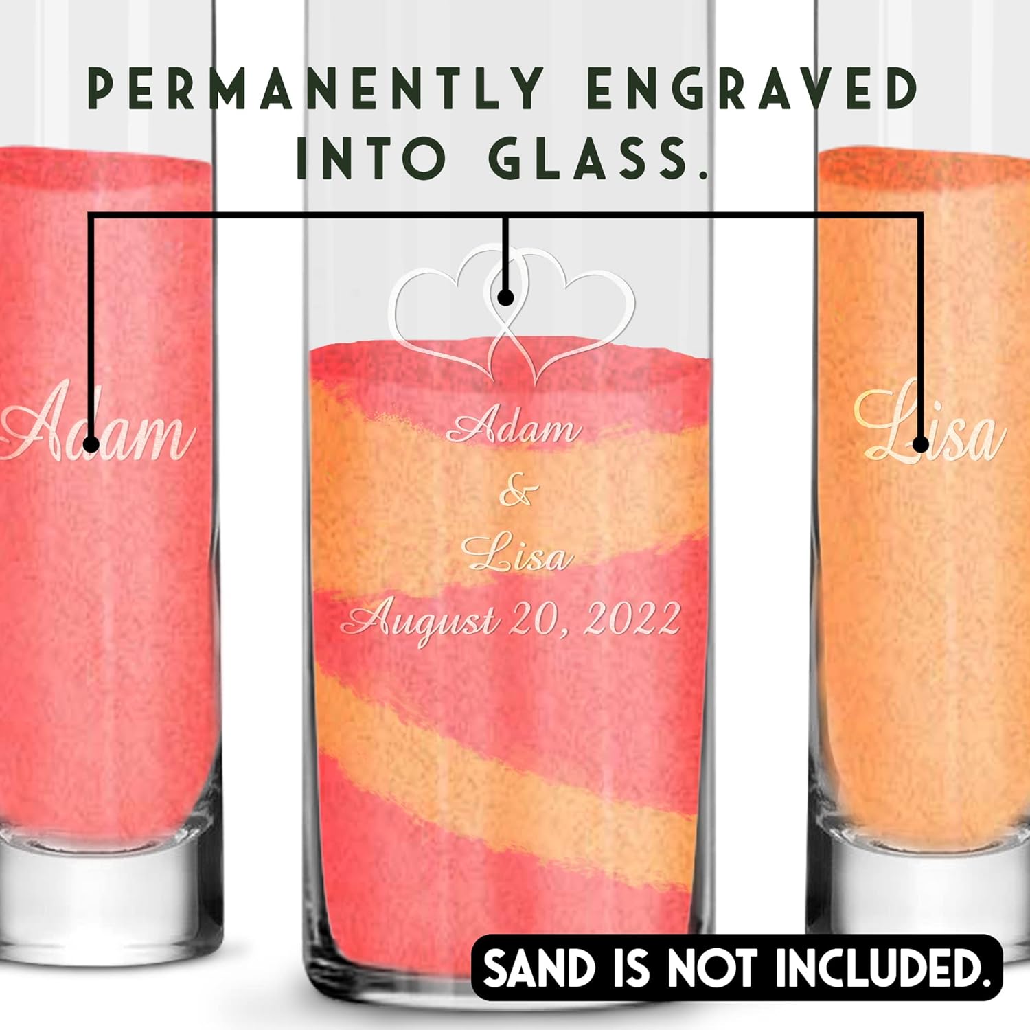The Unity Sand Ceremony is a popular choice for celebrating your union. Mix of sand symbolizes the union of “two into one.” Wedding Sand Kit is always a great choice for many couples as it makes a beautiful keepsake that can be displayed in their home after the ceremony. Children can also take part in the ceremony with matching vases. Two families joining as one Blended Family, love this set as it signifies coming together and blending lives of two families. Set is perfect for Blended Family Wedding Sand Ceremony Kit or use it as a Unity Candle Alternative. Many blended families choose to include Unity Sand Ceremony on their wedding day and prefer to include their children in the ceremony. This gorgeous set perfectly represents the love each family has for the other and allows the bride, groom, and their children to participate. Additional vases for children or other guests can be purchased during “Customization” of the order. Many couples prefer to use this set as an alternative to Unity Candles. The wedding couple and children will find this set very easy to use. No funnel is necessary to pour the sand into the center piece. Large top opening, is perfect for keepsakes such as seashells from your honeymoon, sand from the beach or keeping wine corks as mementos. The set includes a 9 inch tall center piece, which holds approximately 42 oz of unity sand. The diameter of the center piece is 3.5 inches. The two side pouring vessels are 7.5 inch tall and hold approximately 6.75 oz of sand. The opening of side pouring vases is 2 inches. This set DOES NOT include unity sand.