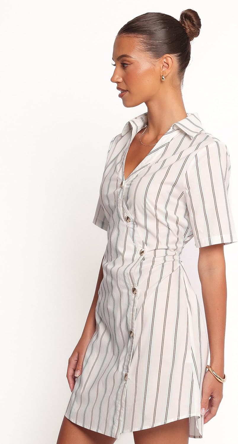 The Hayes Mini Dress in Blue Stripe will become your go-to for easy styling. Ameless pinstripe design, a collared neckline, and shell button , it transitions perfectly from day to night. The back tie adds a customizable fit, while the v-neckline gives just the right touch of modern elegance.