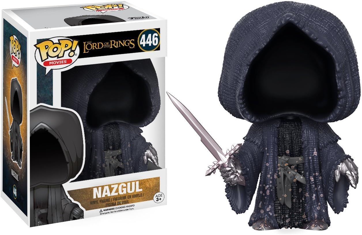From The Lord of the Rings, Nazgul [Ringwraiths], as a stylized POP vinyl from Funko! Figure stands about 4" tall & comes in a window box for display. Collect the entire line of Hobbit & Lord of the Rings Funko Pop! Vinyl's: Gollum, Sauron, Gandalf, Smaug, Lurtz, Merry Brandybuck, Pippin Took, Aragorn, Gimli, Boromir, Treebeard 6", Balrog 6", Eowyn, Bilbo Baggins, Thorin, Oakenshield, Tauriel, Azog, Twilight Ringwraith, Legolas, Arwe, Samwise Gamgee, Saruman, Nazqul, Frodo Baggins, Ringwraith, Dunharrow King, Witch King of Angmar, Lady Galadriel, Elrond, Aragorn King Elessar, Arwen & Tauriel. Collect the entire line of The Hobbit: The Battle of Five Armies Funko Pop! Vinyl's: Bilbo Baggins, Thorin Oakenshield, Tauriel, Azog, Legolas, Gollum, Sauron, Gandalf, Smaug & Eowyn. (Each Sold Separately) Includes a Pop box protector fit for any collectors investment.