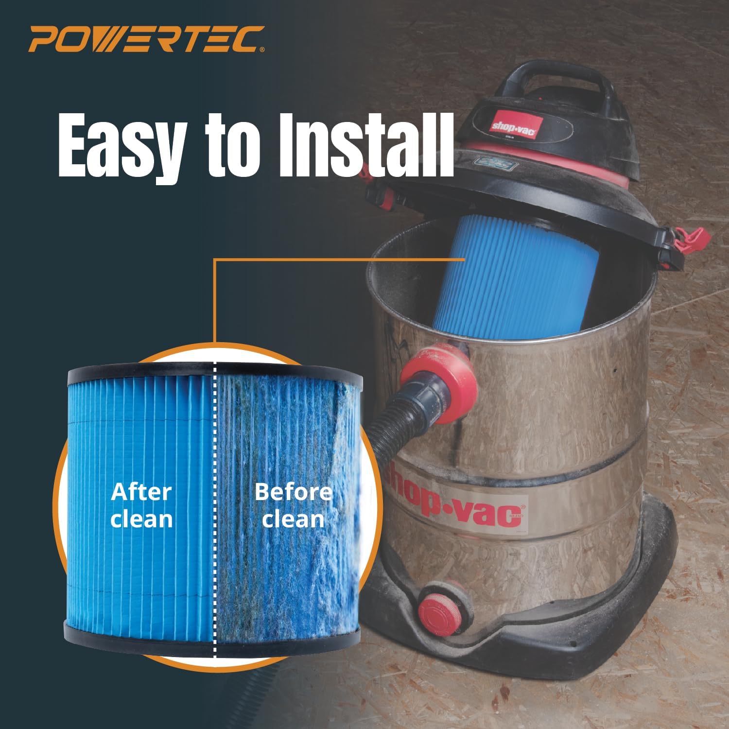 Introducing the High Performance 5 Gallon+ Filter Replacement Cartridge by POWERTEC.If you're looking for a high-quality replacement Shop-Vac filter that captures 85~95% of dust and debris down to 0.3-1 micron, look no further than our premium filter.Replacement for Shop-Vac 90304 / 90350 / 90340 Cartridge filtersPicture the satisfaction of a cleaner workshop and job site, knowing you're also saving money and reducing waste. This filter's long life and easy cleaning mean less frequent replacements.Advanced Filtration for More TaskNow, you can upgrade your vacuum's performance with our advanced filtration. It's ideal for tackling everyday dirt, messes, workshop sawdust, or even larger-scale woodworking cleanups. Experience the difference a superior filter makes – cleaner spaces, and fewer filter replacements interrupting your work.Simple Installation, Lasting ValueDitch the frustration and get back to cleaning with our filter's tool-free installation. Designed for compatibility with most 5-gallon and above Shop-Vac models, a quick swap is all it takes to boost your vacuum's power. Invest in a filter that combines unmatched filtration, durability, and value - it's the smart choice for you and your vacuum.Introducing the Replacement vac filters intended for Shop Vac 90671 5-8 Gallon by POWERTEC.These high-efficiency vacuum filters present a premium and reliable alternative intended for Shop Vac 90671 5-8 Gallon Vacuum cleaners. Perfectly suited to collect an assortment of dry debris, these dust collecting bags are heavy duty and work flawlessly in accommodating 5-8 Gallon models.They feature a unique design that eliminates clogging or blockage, preventing your vacuum from overfilling. They are easy to install and replace. Simply toss and discard for a quick and easy clean-up. In the garage, at a worksite or on the go - you'll find these perfect for capturing all types of fine dust particles such as drywall dust, sawdust, or cement dust. These cost effective vacuum accessories serve as premium replacement filters.【REPLACEMENT FOR SHOP-VAC VACUUM BAGS】: Shop-Vac Bags: Type E (90661, 9066100, 9066108, 9066111, 9066127, 9066133, 9066166) | Type H (90671, 9067100, 9067108, 9067111, 9067127, 9067133, 9067166)【COMPATIBILITY FOR SHOP-VAC VACUUMS】: 5920588|5971836|5982805|5985005|9258006|5989305|5989405|5985038|5971536|14RT300A (9650610)|87MT550A (5875110)|CH87-650C (5873410)|H87S600Cr (5872800, 5872810, 5872911)|H87S650C (5872510)|SH14-C350 (5760611)|SM12-300A (5950600)|SS11-450 (5989300)|SS12-300A (5985000)|SS12-350A (5987000)|SS14-300A (5985100)|SS14-350A (5987100)|SV2021015 (5971636)POWERTEC is a leading manufacturer of high quality woodworking and construction tools, accessories, machines, and an assortment of OEM replacement parts. We are committed to exceeding expectations, while bringing the latest innovations, technology, and product development to the industry.