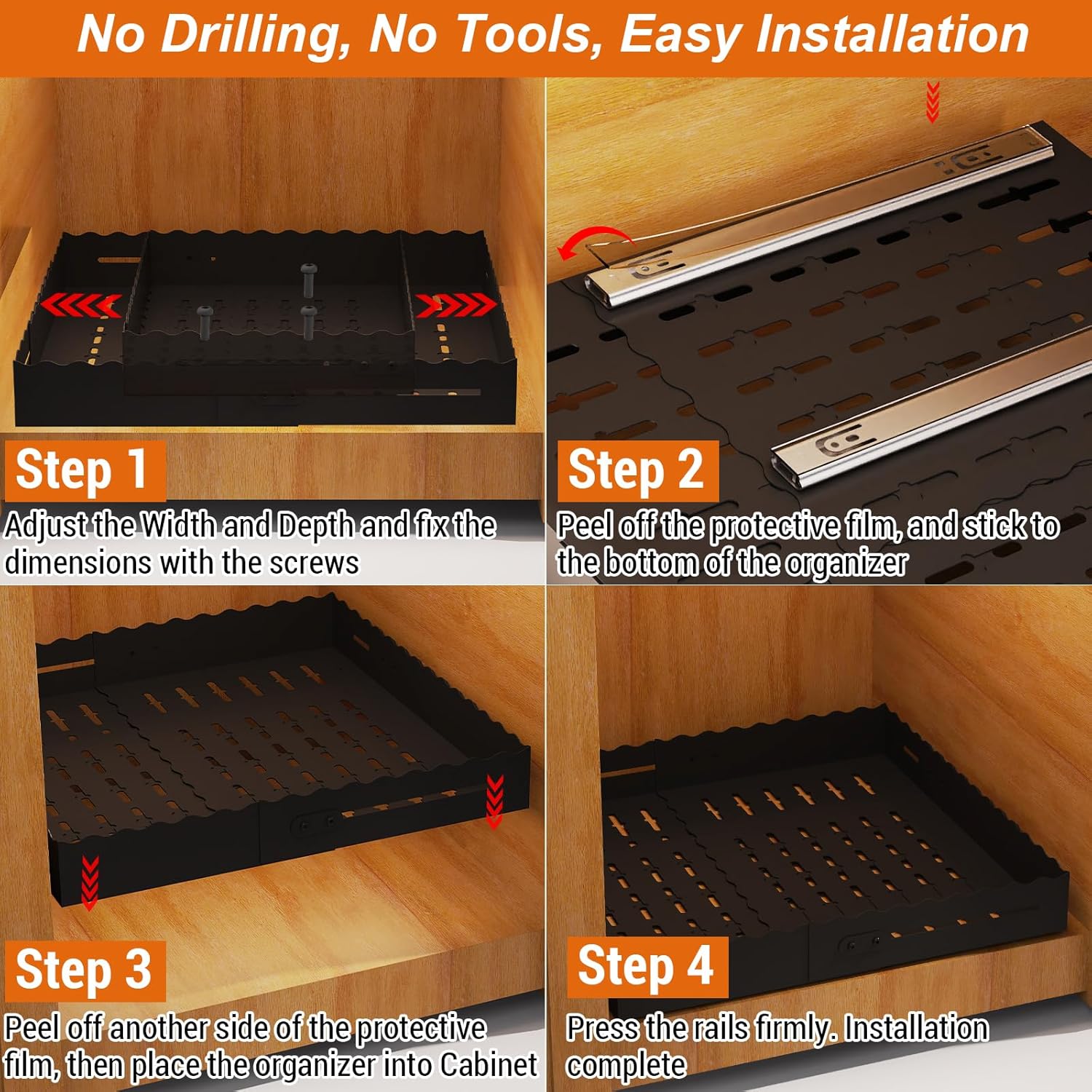 | Included Components | 1x Expandable Drawer Organizer, 1x User manual, 3x Nano adhesive strips, 3 Cabinet rasing pads, 4x Flat head screws, 6x Installation screws, 1x Allen wrench |