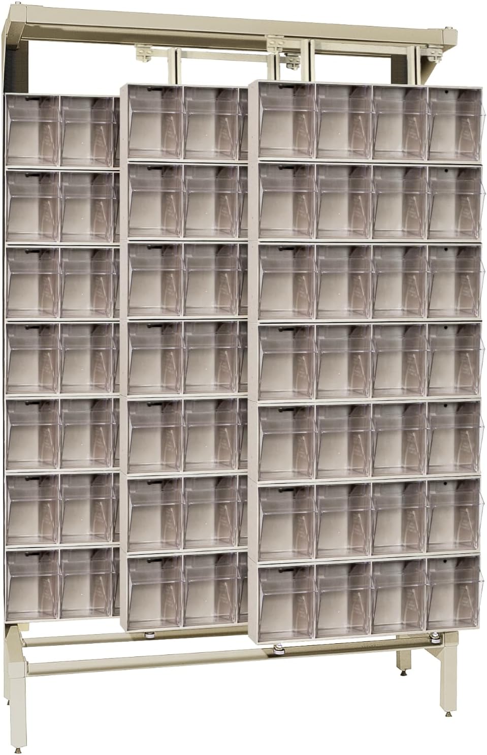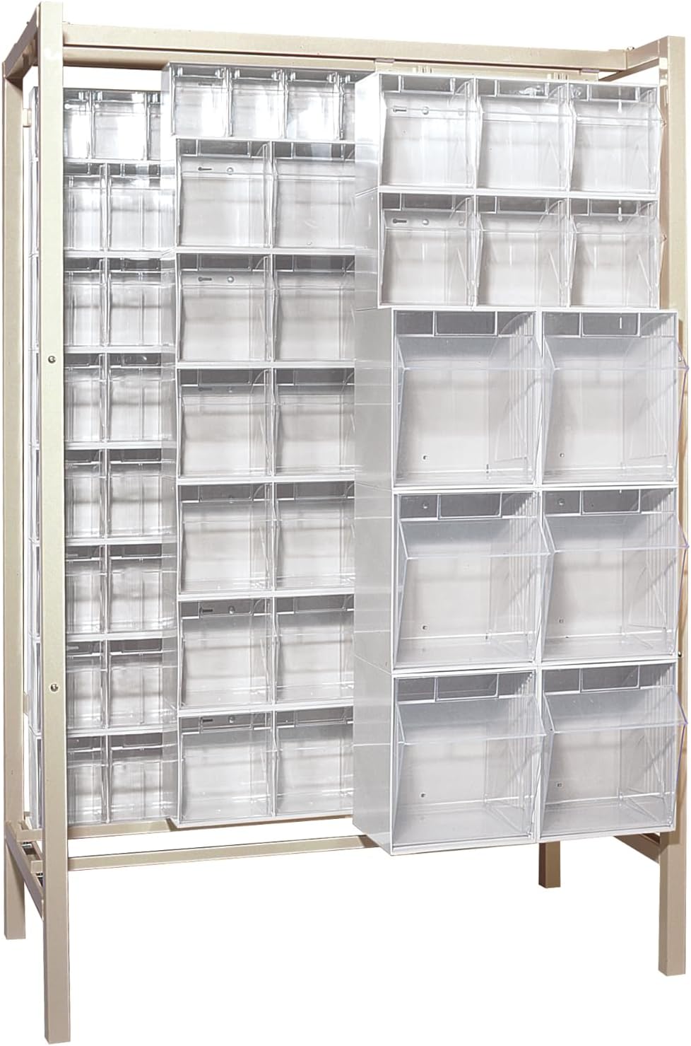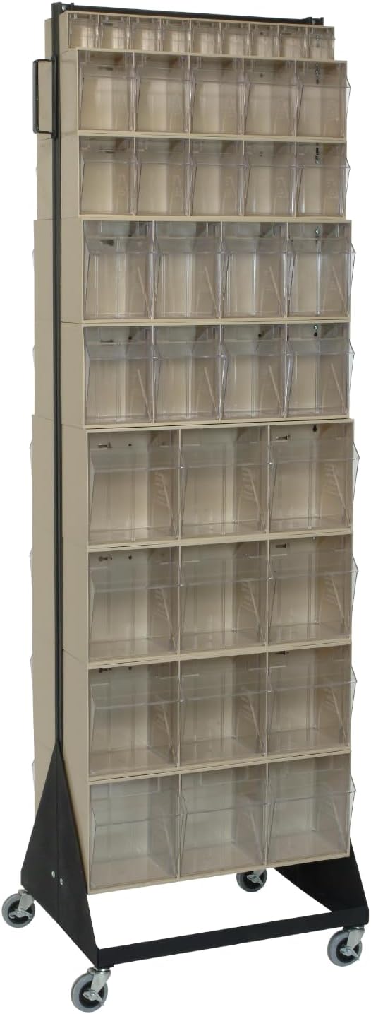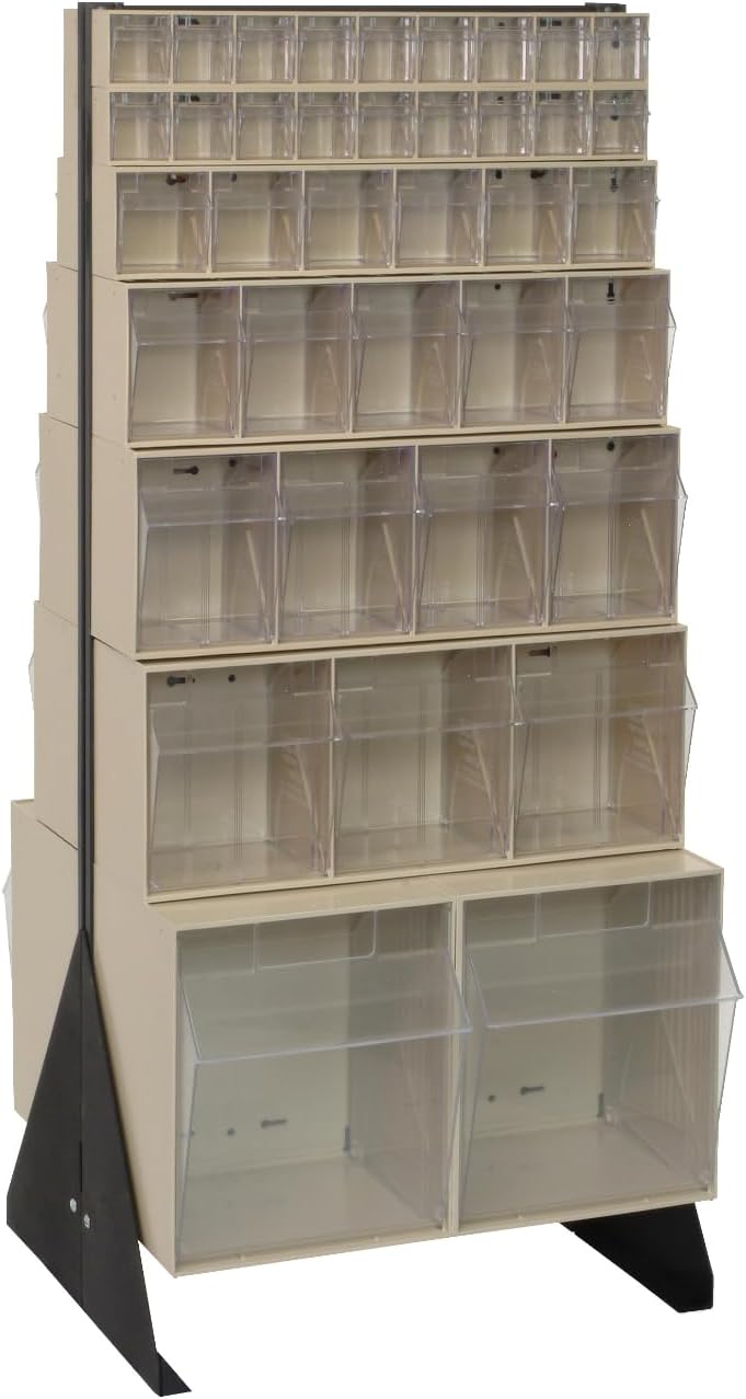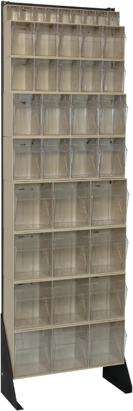 The Quantum QFS170-36WT 36 Drawer Tip Out Bin Stand is a complete, preconfigured storage solution engineered to organize and streamline small parts management. Measuring 75"H x 24"W x 10"D, this single sided bin rack is constructed from heavy-duty 14-gauge steel for dependable strength and stability, supporting up to 300 lbs. The unit includes 36 clear tip-out bins in multiple sizes, allowing you to sort and store a wide range of components while maintaining full visibility of contents. As a dedicated tip out bin stand, it keeps frequently used items accessible and neatly arranged, making it ideal for high-traffic work areas that require fast, accurate retrieval. Built to function as a reliable drawer bin organizer and parts storage stand, the Quantum QFS170-36WT enhances efficiency in workshops, maintenance departments, and supply rooms. Its vertical configuration maximizes floor space while serving as a hardware organizer rack, small parts cabinet, or inventory drawer rack. The durable powder coat finish and robust frame provide long-term structural performance in demanding commercial environments. Whether used as a workshop storage unit or supply organizer station, this commercial bin stand helps reduce search time, improve organization, and create a more productive, clutter-free workspace. Item Details: Container Weight: 84 lbs. Dimensions: 8" x 23-5/8" x 75" Bin Load: 36