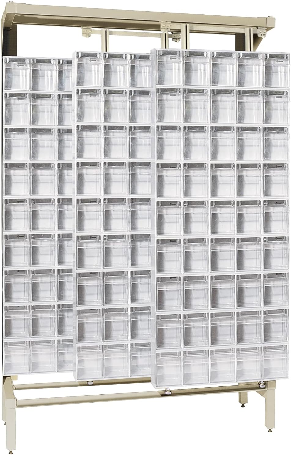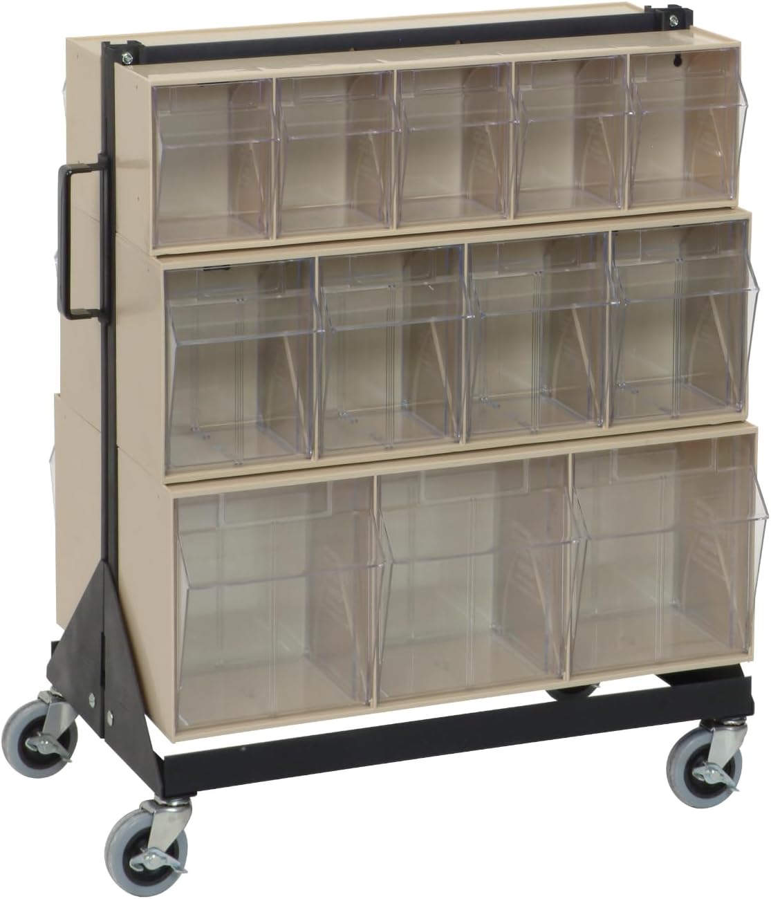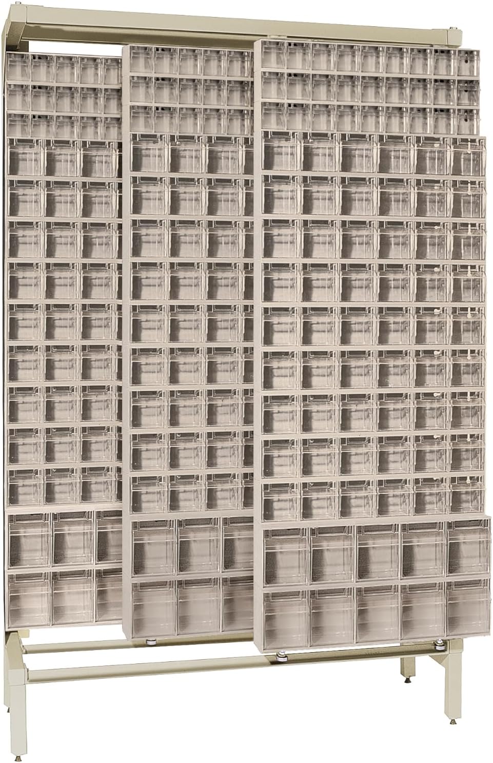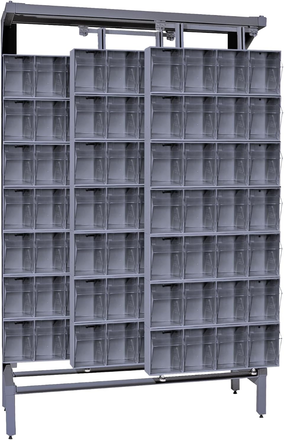 The Quantum QFS170-36WT 36 Drawer Tip Out Bin Stand is a complete, preconfigured storage solution engineered to organize and streamline small parts management. Measuring 75"H x 24"W x 10"D, this single sided bin rack is constructed from heavy-duty 14-gauge steel for dependable strength and stability, supporting up to 300 lbs. The unit includes 36 clear tip-out bins in multiple sizes, allowing you to sort and store a wide range of components while maintaining full visibility of contents. As a dedicated tip out bin stand, it keeps frequently used items accessible and neatly arranged, making it ideal for high-traffic work areas that require fast, accurate retrieval. Built to function as a reliable drawer bin organizer and parts storage stand, the Quantum QFS170-36WT enhances efficiency in workshops, maintenance departments, and supply rooms. Its vertical configuration maximizes floor space while serving as a hardware organizer rack, small parts cabinet, or inventory drawer rack. The durable powder coat finish and robust frame provide long-term structural performance in demanding commercial environments. Whether used as a workshop storage unit or supply organizer station, this commercial bin stand helps reduce search time, improve organization, and create a more productive, clutter-free workspace. Item Details: Container Weight: 84 lbs. Dimensions: 8" x 23-5/8" x 75" Bin Load: 36