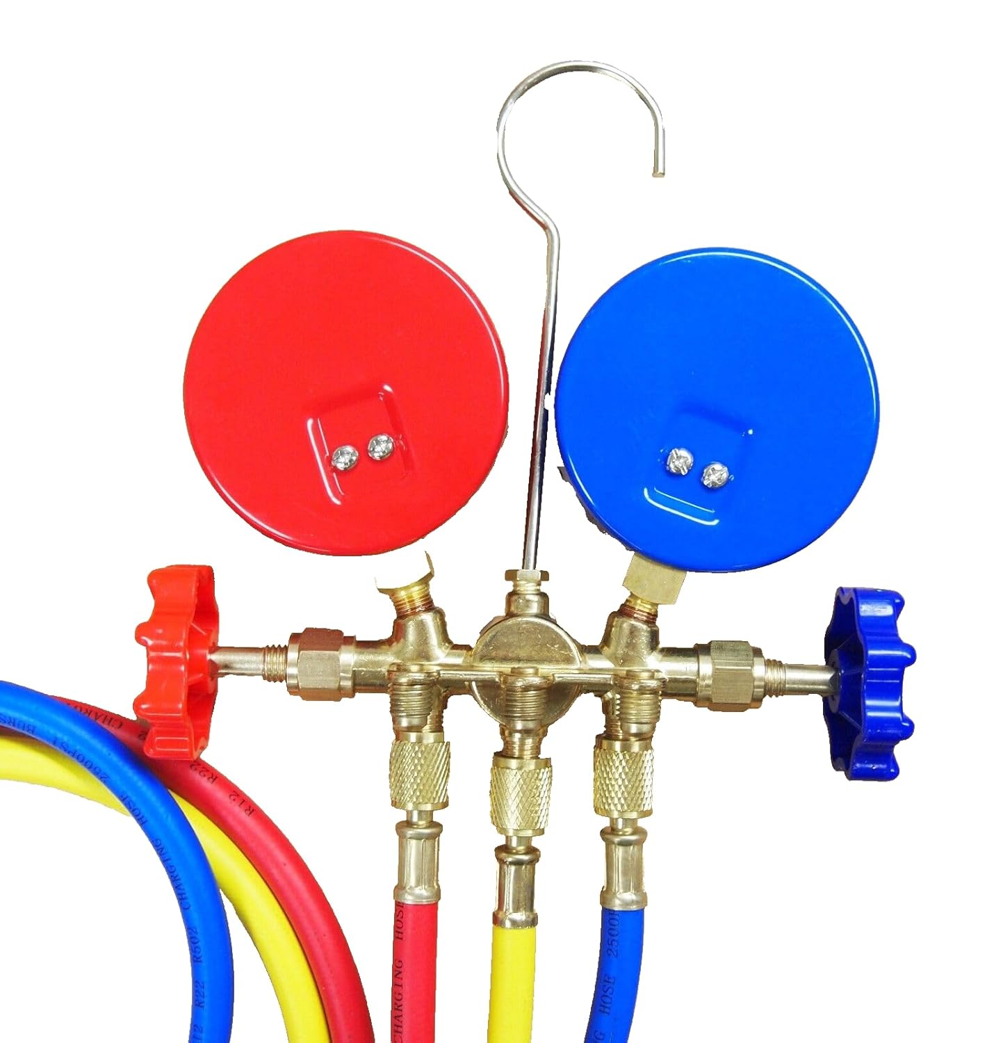 Compatible with R12 R22 R134A R404a Durable Brass body Large 3 in. Gauge is easy to read 3 Color-coded Freon service charging rubber hose 2500PSI Burst 500PSI Max. W.P. 1/4" Fitting on both end Overall length 59 in. R134 Quick couplers for High/Low fittings (Red and Blue) included R134 ACME Adapter (1/4" SAE male to 1/2" ACME female) included