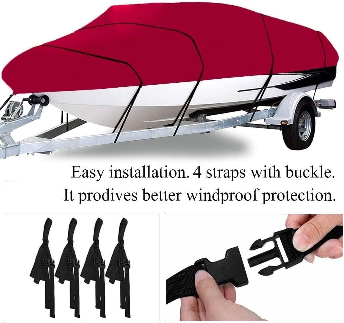 Color: Burgundy RedSize (4 sizes available)11-13 feet (420x270 cm): fits boats 11-13 feet long14-16 feet (530x290 cm): fits 14-16 foot boats up to 90 inches wide17-19 feet (600x300 cm): fits boats 17-19 feet long with beam widths up to 95 inches20-22 feet (700x290 cm): fits boats 20-22 feet long with beam widths up to 100 inchesFeaturesComes with a storage bag for easy carrying and protection when not in usePackage Includes1x boat coverProduct 5 sockets, 3x windproof ropeCautionTransition: 1 cm = 10 mm = 0.39 inchesPlease allow 1-3 cm error due to manual measurement. Please make sure you don't mind before you bid.Please understand that the color deviation may vary due to different monitor settings.