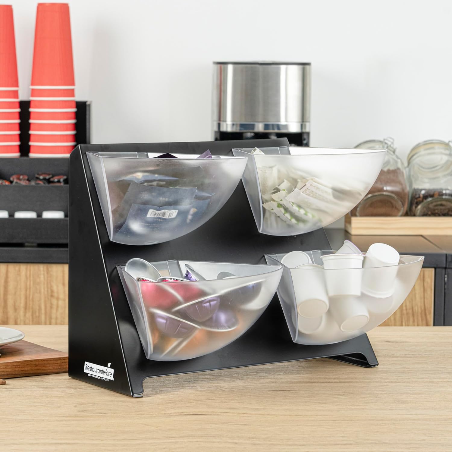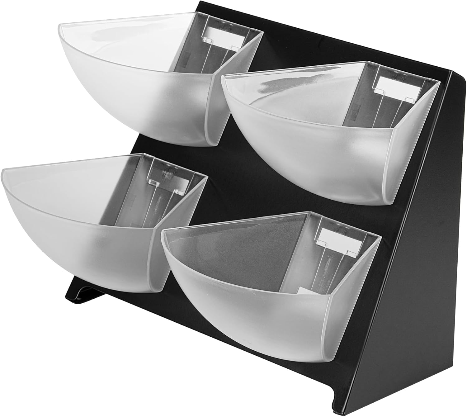 Easily organize an assortment of condiments with our Met Lux Condiment Holder. Equipped with 4 separate compartments, this handy condiment carrier provides ample space to fill up its clear bins with a variety of sugar packets, creamers, teas, and more. The 4 clear plastic bins of this condiment organizer are conveniently removable for quick refills and easy cleanup. Constructed from premium steel, this restaurant condiment caddy is built for long-lasting use and is ideal for displaying on coffee or condiment stations at your foodservice establishment. With a sleek black finish, this chic condiment holder effortlessly complements the decor at your cafe, fast-casual restaurant, or buffet. This tabletop caddy measures 15.4 inches long by 10 inches wide by 10.5 inches tall. Shipped in a 1 count box.
