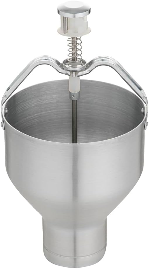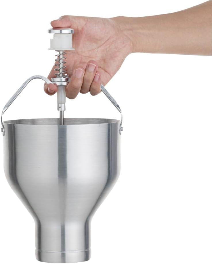 Make perfect pancakes, waffles, crepes, and more using our Met Lux Round Aluminum Pancake / Waffle Batter Dispenser. Designed with 8 portion control dial settings, this waffle batter dispenser is ideal for producing equal-sized pancakes without spilling or wasting batter. The portion control settings range from 0.5 ounces to 3 ounces, allowing you to choose the amount of batter that is dispensed. This pancake dispenser features a plunger with an easy-to-push button at the top that provides you with a simple way to dispense batters onto cookware. The tapered end and circular design of this batter dispenser is great for instantly creating rounded shapes. This waffle batter dispenser can hold up to 88 ounces of batter to consistently make large amounts of waffles or crepes. Made with high-quality aluminum, this batter dispenser is lightweight yet durable, making it easy to transport throughout your commercial kitchen. For quick cleanup after use, simply hand wash this waffle batter dispenser. This pancake dispenser measures 6.5 inches in length by 6.5 inches in width and 13 inches in height. Sold in a 1 count box.