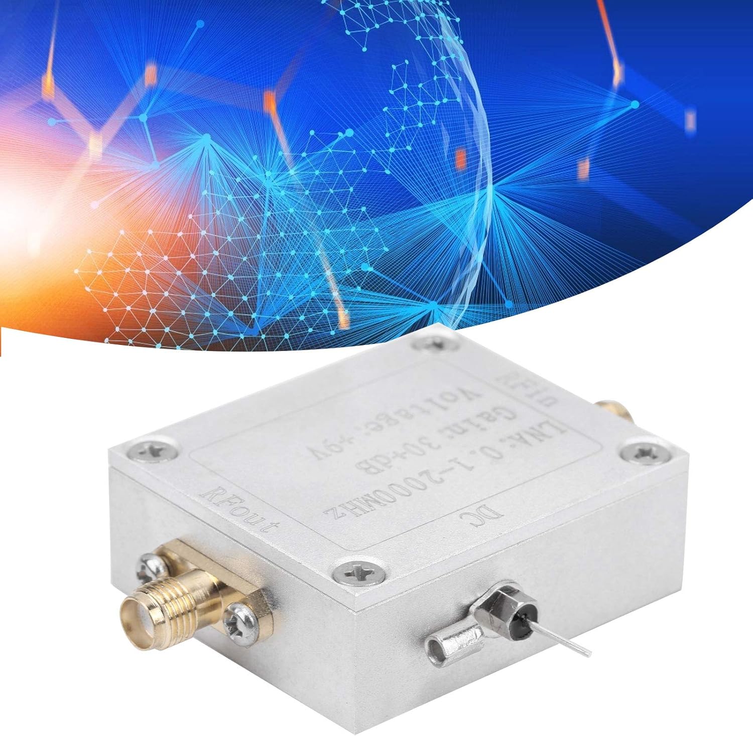 [DURABLE ALUMINUM ALLOY SHELL] ensures resistance and extends service life.[HIGH-ACCURACY FREQUENCY] with a broad acceptance range increases the scope of applications.[WIDE FREQUENCY RANGE] and high gain with low noise figure ensure optimal performance.[ENHANCE COMMUNICATION DISTANCE] in various radio frequency receiving front ends.[VERSATILE APPLICATIONS] include remote control receivers and cable TV signal amplifiers.Spec:Item Type: RF AmplifierMaterial: Aluminum alloyWorking Frequency: 0.1-2000MHzWorking Voltage: 9-12V (suitable for lithium battery power supply)Working Current: 37mAAmplification Gain: 32dB (typical value)F= 0.1MHz, Gain=32dBF=500Mhz, Gain=32dBF=1000MHz, Gain=29dBF=1500Mhz, Gain=25dBF=2000MHz, Gain=20dBMaximum Output: 13dBm (20mW)Noise Figure: 1.9dBSystem Impedance: 50 ohmConnector Model: SMA-KPackage List:1 x RF AmplifierNote: