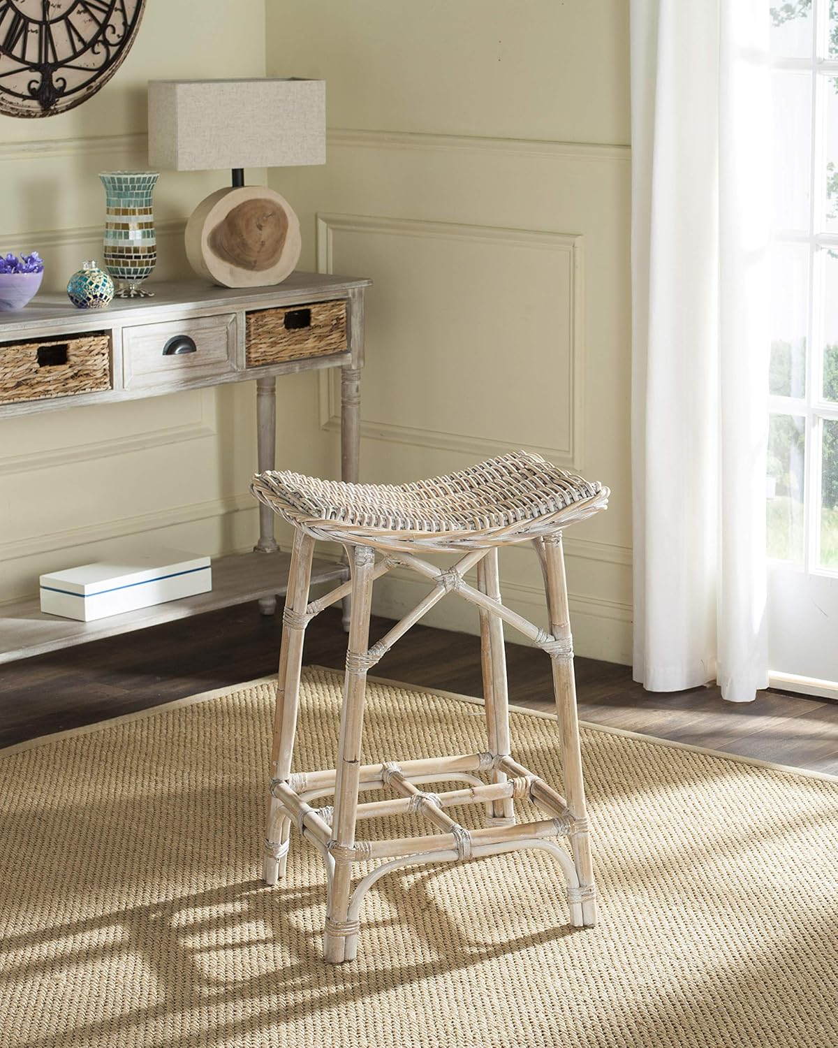 Intricately woven natural washed kubu rattan makes a stylish barstool for a kitchen island or bar. Designed for comfort, the curved swill addle seat cradles the body, while classic wrapped legs and footrest offer the perfect marriage of form and function.