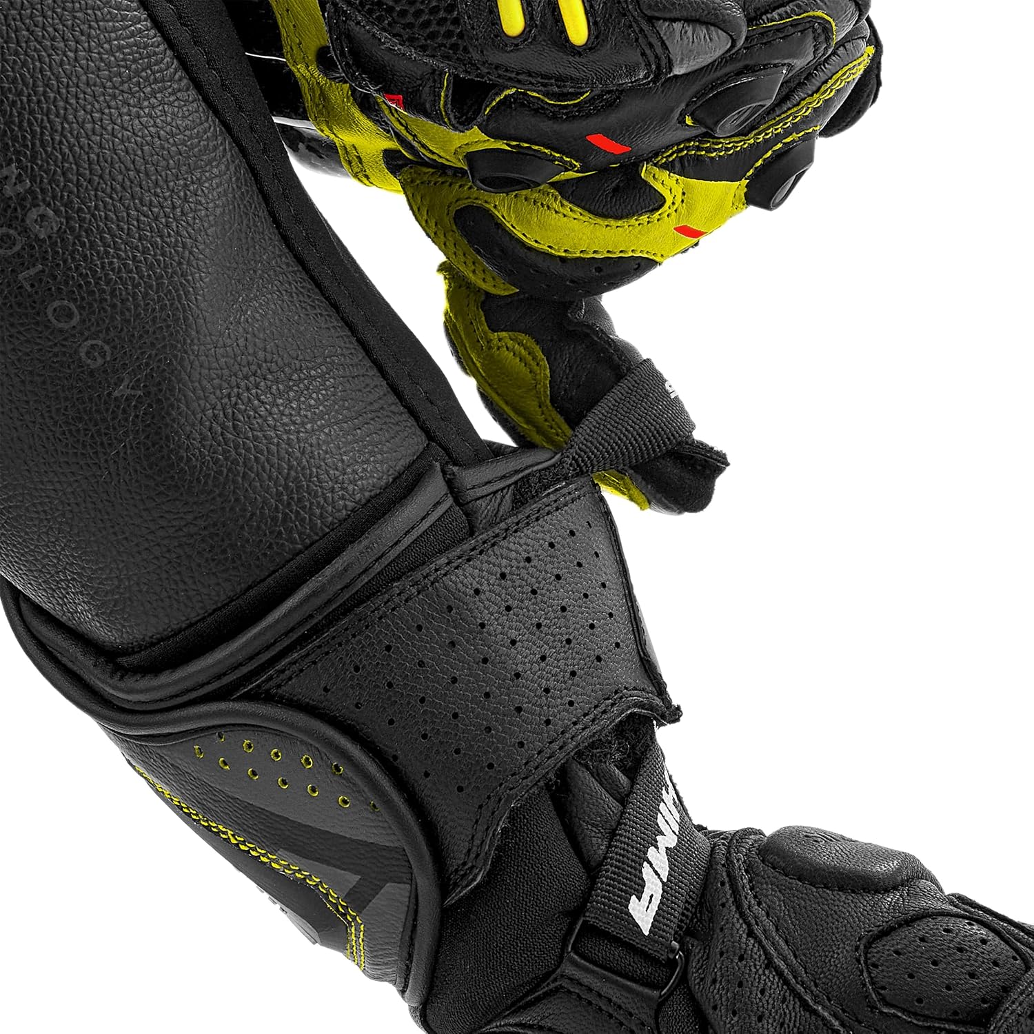 Unleash the road warrior within you with the SHIMA RS-3 — the ultimate leather motorcycle gloves built to dominate every ride. Whether you're carving corners on your favorite motorcycle route, ripping through dirt on your quad bike, or just cruising in the summer sun, these racing-inspired gloves deliver protection and performance without compromise. Designed for both men and women who live for the thrill, they blend hardcore safety with fierce biker style that turns heads from track to street. Crafted from natural goat and kangaroo leather, these motorcycle gloves feel as good as they look—tough where it counts, smooth where it matters. The carbon-reinforced protector backed by memory foam shields your hands like armor, while TPU sliders and palm reinforcement mean you’re ready for anything the road (or off-road) throws your way. From city rides to high-speed motorcross adventures, these gloves are your second skin. Comfort meets control with pre-curved fingers, stretch panels, and external stitching that eliminate pressure points for long-distance freedom. Accordion zones flex effortlessly with every twist of the throttle, making them ideal for summer rides or intense motocross sessions. A neoprene cuff and the V-Lock Pro fastener keep everything snug, secure, and race-ready. And yes, these gloves are smart too. Touch Tip panels let you swipe, tap, and zoom on your phone or GPS without ever taking them off. Fast to slip on with the puller strap, they’re the kind of men’s clothing gear that redefines “essential.” Sleek, rugged, and ready for anything — the RS-3 isn’t just an accessory, it’s your passport to the ride.
