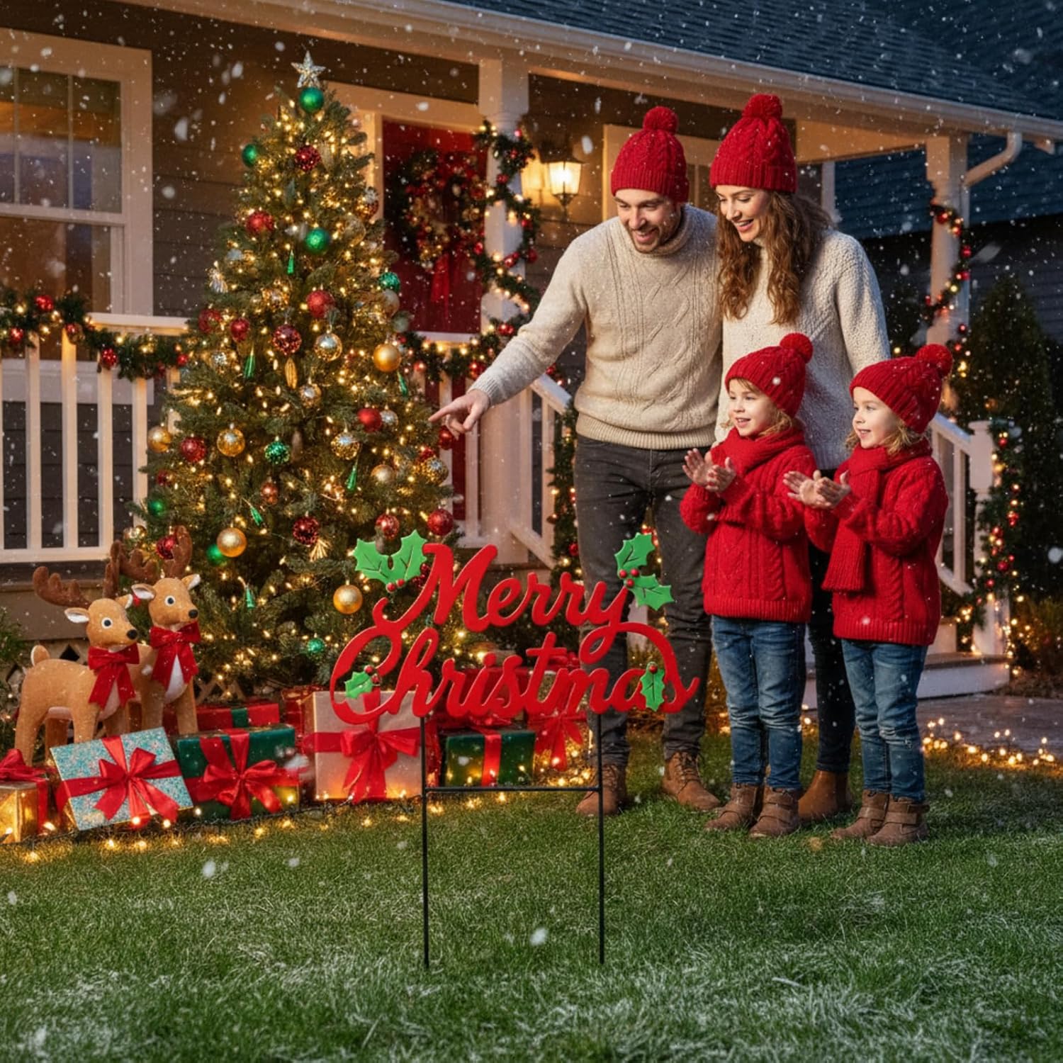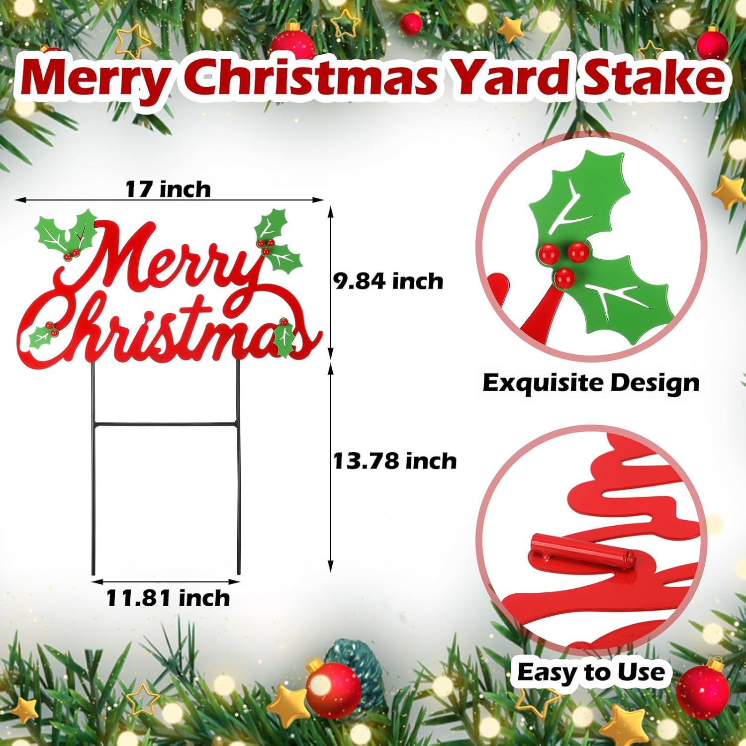 Features: Exquisite Design: This Christmas yard stake is designed with eye catching red "Merry Christmas" letters, green leaves and cute red berries, which is very exquisite and especially suitable for the Christmas atmosphere, giving you a strong festive feeling. Sturdy Material: This large Christmas yard stake is made of quality metal and is sturdiness. Its sturdy construction ensures its sturdiness, allowing it to maintain its vibrant and elegant appearance throughout the holiday season. The "Merry Christmas" text and metal stake are split designs, very easy to store. Specifications: Material: metal Color: green, red Size: About 16.93 x 9.84 inches/ 43 x 25 cm, 13.78 x 6.1 inches/ 35 x 15.5 cm Package includes: 1 x Metal Merry Christmas Yard Stake Notes: Manual measurement, please allow slight errors on size. The color may exist a slight difference due to different screen displays.