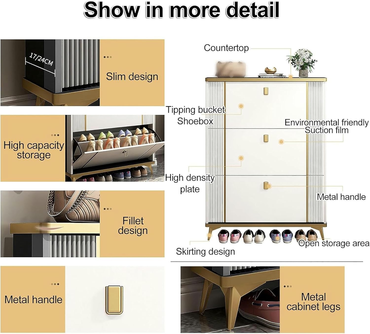 Upgrade your shoe storage with our innovative Bucket Shoe Cabinet, designed to seamlessly fit into any modern home. This sleek, space-saving solution features a hidden shoe cabinet, ensuring your shoes remain organized and out of sight. With three flip drawers, our tall shoe rack provides ample storage for your entire shoe collection, making it easy to find the perfect pair when you need it. The free-standing tipping bucket design not only enhances your interior aesthetics but also adds a contemporary touch to your living space. Made from high-quality materials, this shoe cabinet is built to last, offering stability and durability for years of use. Available in multiple sizes (50*17*120cm, 60*17*120cm, 70*17*120cm, 50*24*120cm, 60*24*120cm, 70*24*120cm) and colors (White, Gray), it features three doors and an adjustable divider, allowing you to customize the storage to fit your needs. Imagine stepping into a tidy entryway where your shoes are neatly arranged, ready for any occasion. Our Light Luxury Dump Shoe Cabinet is not just a piece of furniture; it's a practical solution to everyday clutter. Transform your space with this stylish and functional shoe cabinet, and enjoy the benefits of a well-organized home. Say goodbye to mess and hello to an elegant shoe storage solution that combines beauty with practicality.