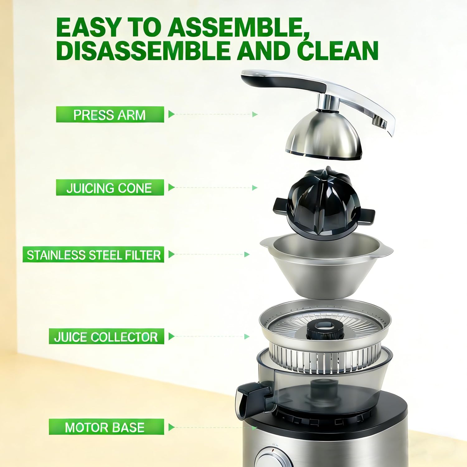 | Included Components | Juice Collector, Juicing Cone, Motor Base, Press Arm, Stainless Steel Filter |