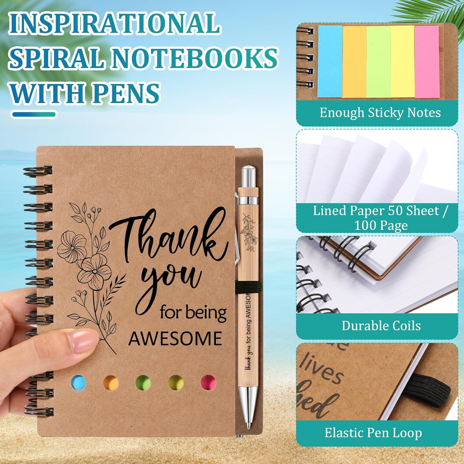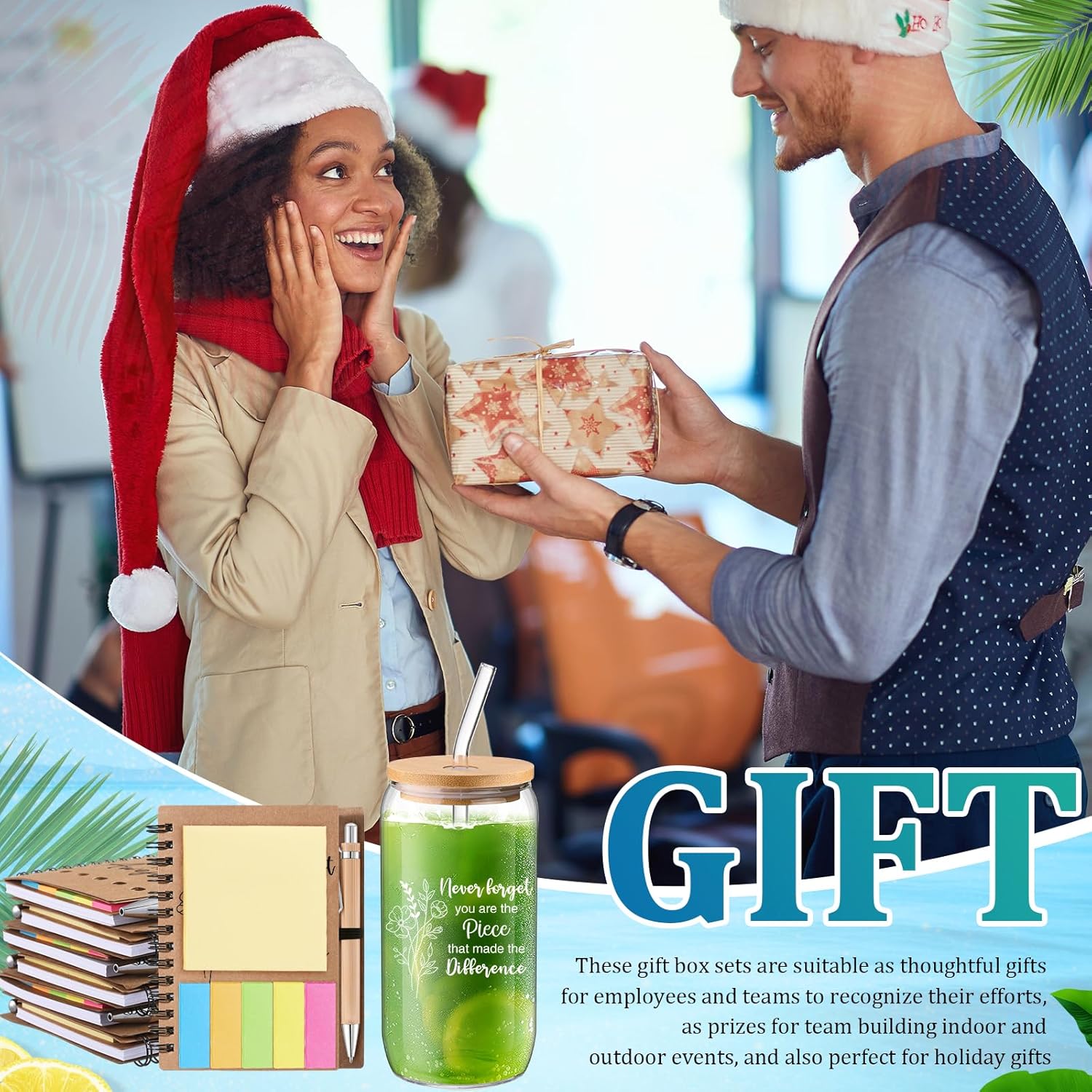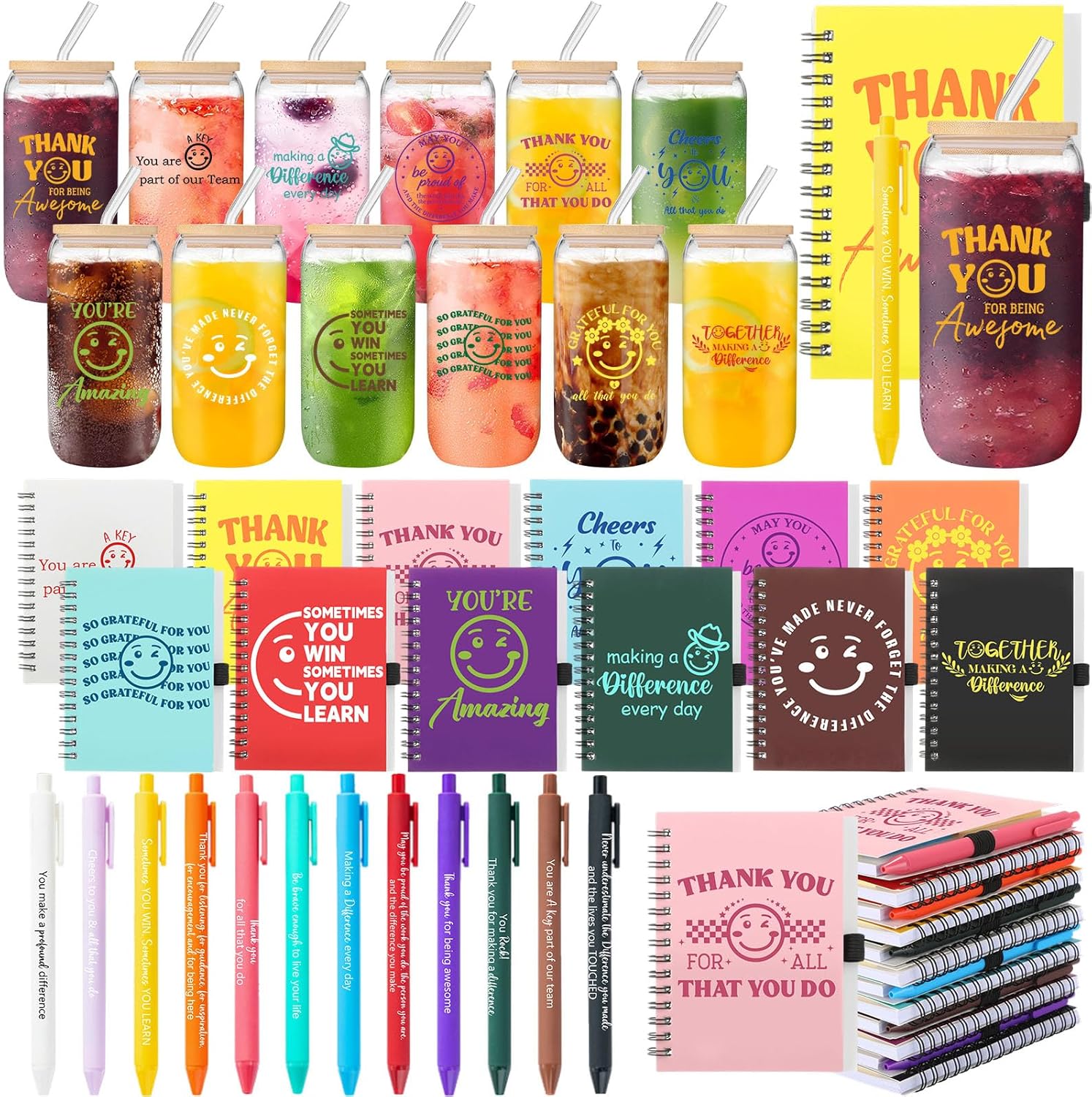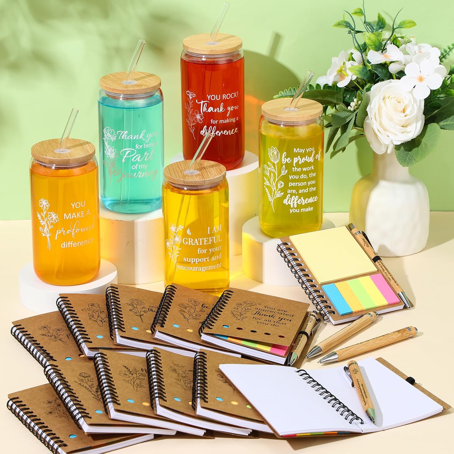 Features: Widely usage: The can-shaped glassware is suitable for indoor and outdoor use. Suitable for any hot and cold drinks. They are not only for offices, or at home but also suitable for swimming pools, front porches, beaches, parties, lakes, patios, picnics, barbecues, camping, cruising, work, travel, boating and more. Ideal for various occasions: These thank you gifts are versatile and can be given on a range of occasions, including employee appreciation events, coworker milestones, or as a token of gratitude for dedicated teachers. Specifications: Material: Glass, Bamboo, Paper Size: notepads: 4.1 x 5.3 inches / 10.5 x 13.4 cm, pen: 5.4 x 0.4 inches / 13.6 x 1 cm Package includes: 12 x Cups, 12 x notebooks, 12 x pens Notes: Manual measurement, please allow slight errors on size. The color may exist a slight difference due to different screen displays.