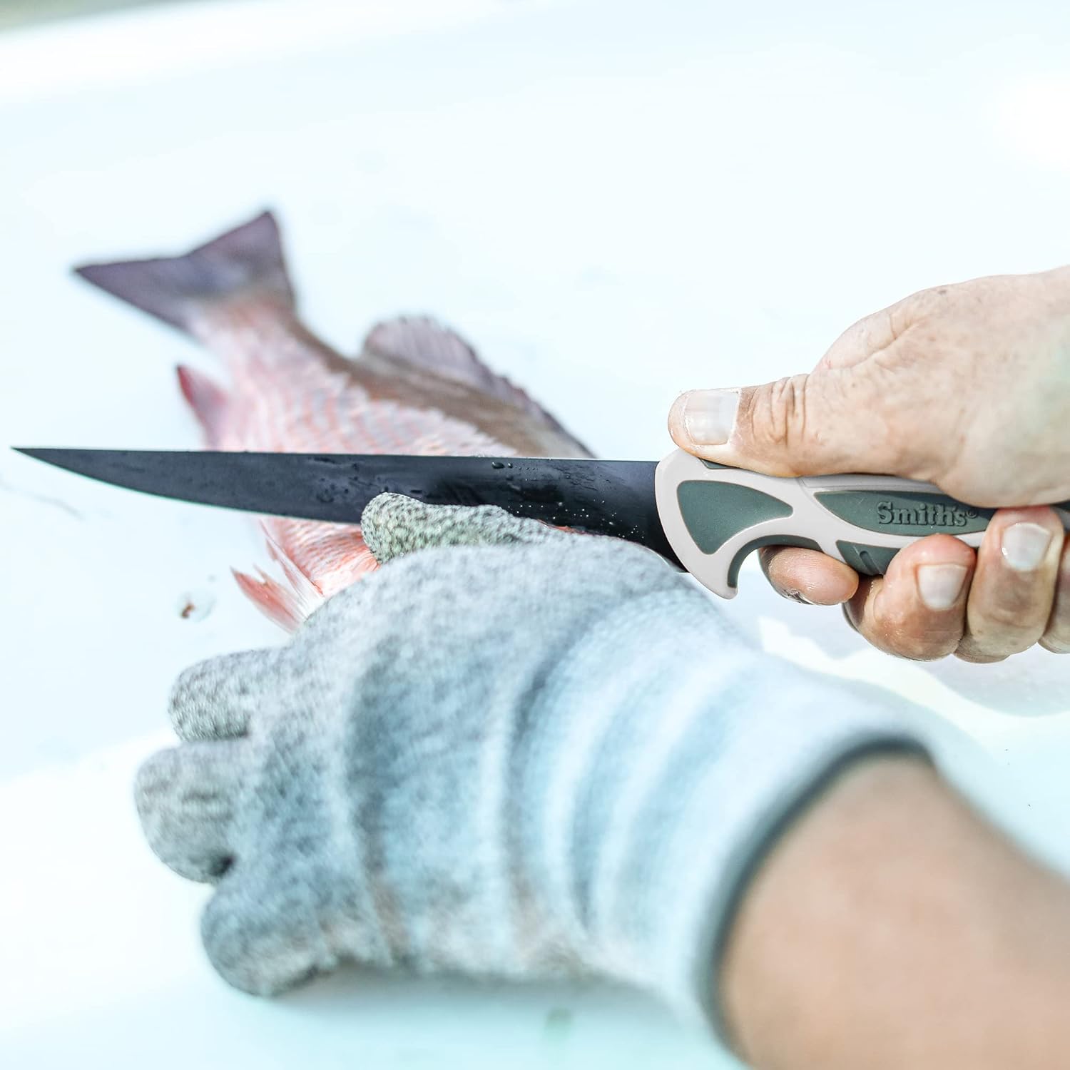 Smith's 7" Lawaia Fillet knife has a non-slip TPE soft grip ergonomic handle and a breathable protective sheath. Features razor-sharp corrosion resistant coated 400 series stainless steel blade.