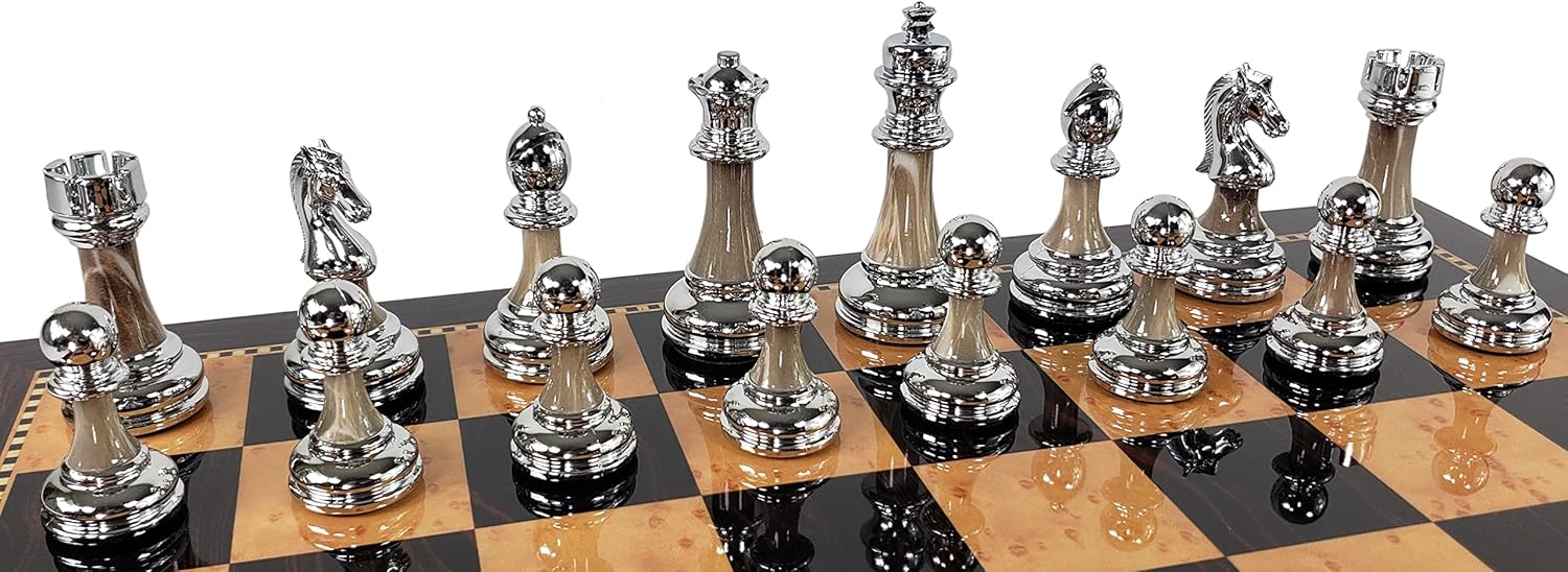 Don't miss out on these staunton chrome and black chrome pro plastic chess men with board. Men are double weighted and feature padded faux leather bottoms. Board features a beautiful high gloss artificial Dark Walnut and Birdseye Maple color laminate over mdf wood. Bottom of board is fully felted. Board Size: 17 1/4" x 17 1/4" x 3 1/2", Playing surface: 15" x 15" with 1 7/8" Squares, Storage compartments are 1 5/8" x 3 3/4" in the front row, Storage compartments are 1 5/8" X 3 5/16" in the back row, Each side has its own drawer. Board Weight: 12 pounds (Without Package). Great looking set!