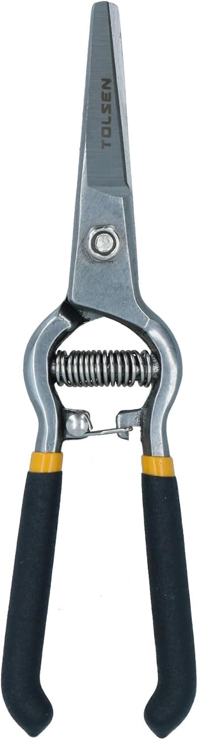 8 inch (200mm) long high carbon steel trimmer, great for trimming, shaping and other quick snips on small plants, flowers or medicinal herbs, goats and pig hoof. 51mm Half smooth blade, sharper and durable (Drop Forged Steel). Comfort grip handle: The comfort grip handles with soft-grip touch points enhance comfort and deter blisters,suitable for left or right hand use. Rubber coated handles, non-slipping design. The shock absorbing bumpers stop jarring vibrations and reduce arm and shoulder fatigue. Imbedded spring won’t pop out even during some heavy use. The spring gently opens blades after each cut to help reduce hand fatigue.