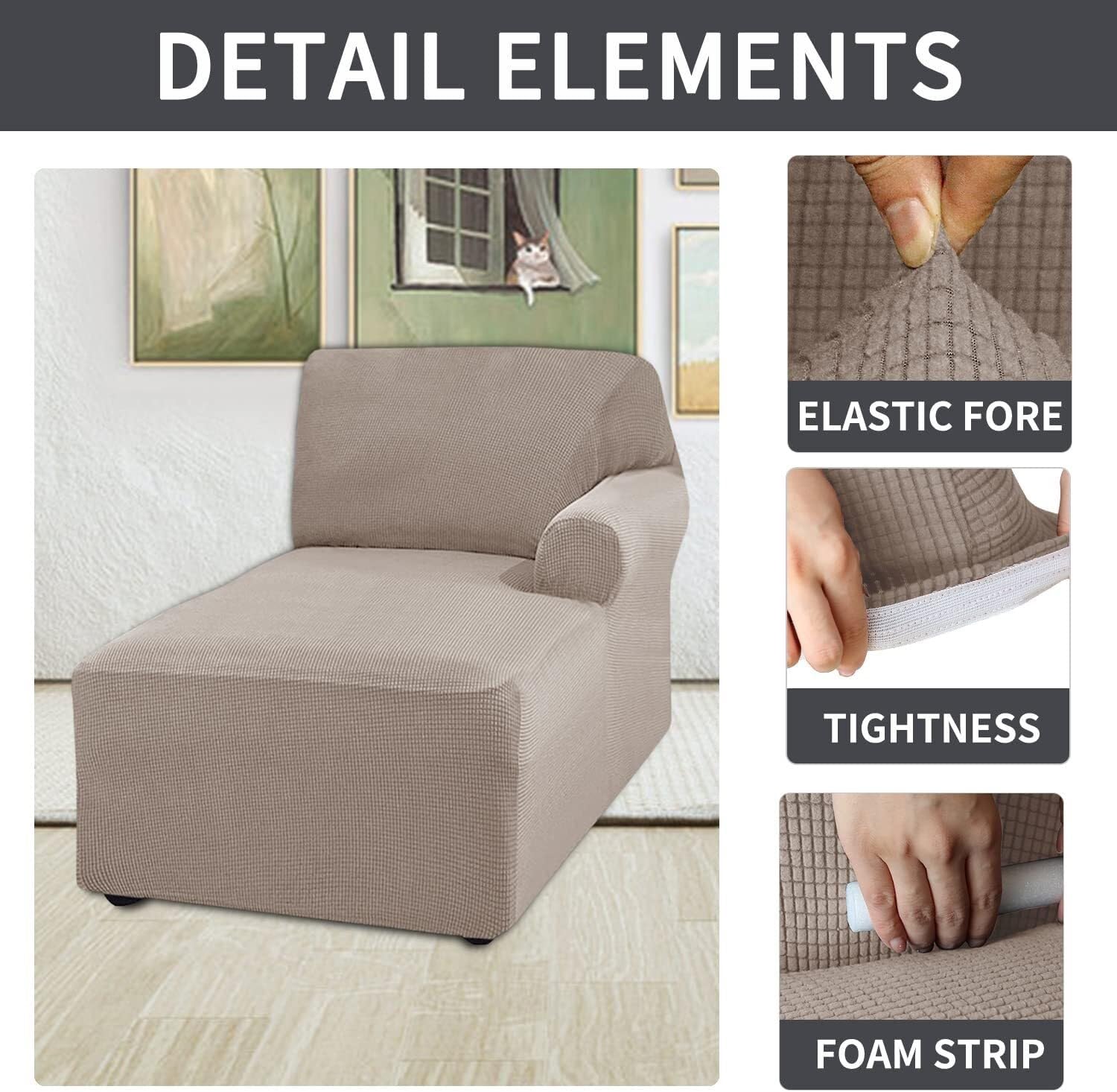 Our Stretch Lounge Chaise Covers are designed to give your furniture a cozy and refreshed appearance while effectively covering stains and imperfections from everyday living. They serve as excellent protectors for homes with kids and pets, thanks to their soft and durable fabric that provides comfort and a visually appealing aesthetic, saving you from the costly investment of new furniture.Key Features:Elastic Cord Bottom: The elastic cord sewn onto the bottom ensures a more uniform style, providing comprehensive protection and a compacted effect.Four Buckles: Attach the four buckles over each leg of the furniture to securely hold the slipcover in place, preventing slipping or shifting.High-Quality Materials: Composed of 85% polyester and 15% spandex, these covers offer a stretchy and comfortable fabric that is extra soft, thick, cozy, and durable.Additional Features:GREAT FIT: To ensure the perfect fit, kindly measure the size of your sofa before purchasing.PROTECT WELL: These covers effectively cover stains and imperfections from everyday living, helping you avoid the costly investment of new furniture.EASY CARE: Machine wash with cold water, do not bleach, tumble dry low, and avoid ironing for effortless maintenance.