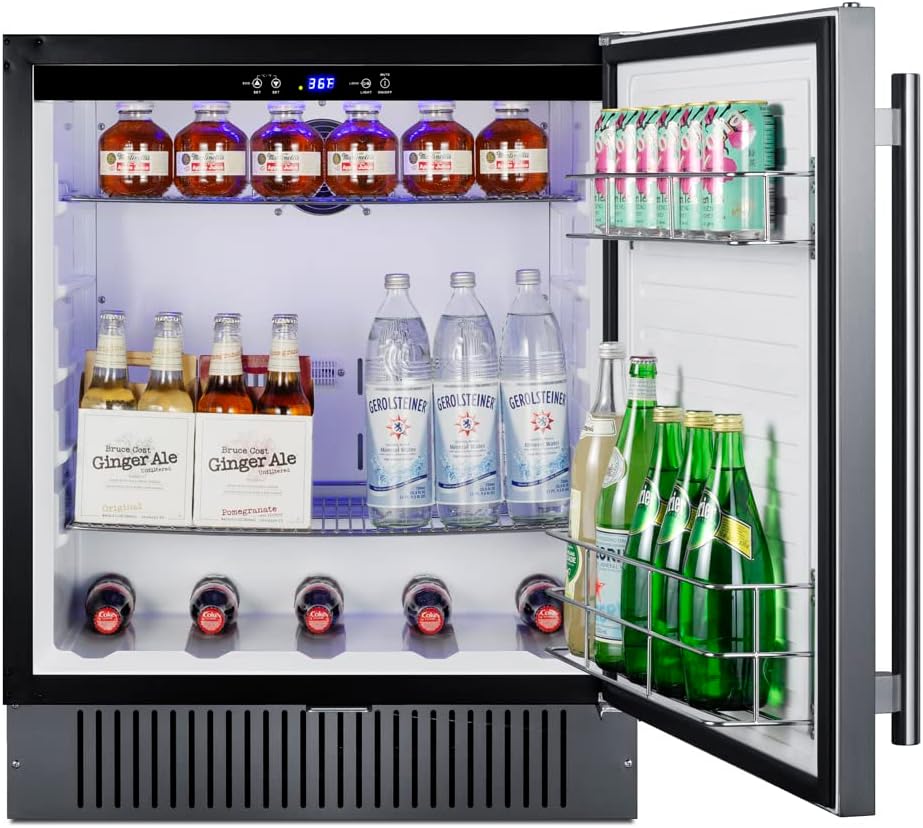 Summit Appliance SPR2700SS 27" Wide Outdoor All-Refrigerator, 4.98 cu.ft Capacity, Automatic Defrost, Interior LED Lighting, Digital Control Panel, Factory Installed Lock, Stainless Steel Door Model SPR2700SS is an all-refrigerator sized just under 27" wide and under 24" deep for an easy fit in any space with limited depth. The versatile design allows built-in installation under counters or freestanding use, with weatherproof construction ideal for outdoor kitchens. The door comes in a stainless steel finish with a vertical grain and a pro style handle. This unit has an integrated flat door hinge in stainless steel that does not add any additional height. We include a factory-installed lock on the door and two keys for optional security as needed. Key Features: - 27" wide undercounter all-refrigerator - Fan-forced cooling ensures the unit is evenly cooled from top to bottom - Weatherproof design approved for outdoor use - Dimmable LED lighting (with 3 brightness settings) in an attractive blue hue - ETL-S listed to NSF-7 commercial standards - Professional handle - Temperature alarm - Digital control panel - Factory installed lock - Stainless steel door - Integrated hinge - White interior - Adjustable shelving - Slotted floor - Automatic defrost Specifications: - Capacity: 4.98 cu.ft. (141 L) - Defrost Type: Automatic - Door: Stainless Steel - Cabinet: Black - Energy Usage/Year: 235.0kWh/year - Voltage/Frequency: 115 V AC/60 Hz - Door Swing: RHD - Shelf Type: Chrome - Shelf Qty: 3 - Full Door Shelf Qty: 2 - Adjustable Shelves: Yes - Thermostat Type: Digital - Fan Type: Interior and Exterior - Level Legs Qty: 4 - Interior Light: Yes - Temperature Range: 36 to 46ºF - Dimensions (HxWxD): 33.88 x 26.75 x 23.25 inches - Weight: 101 pounds