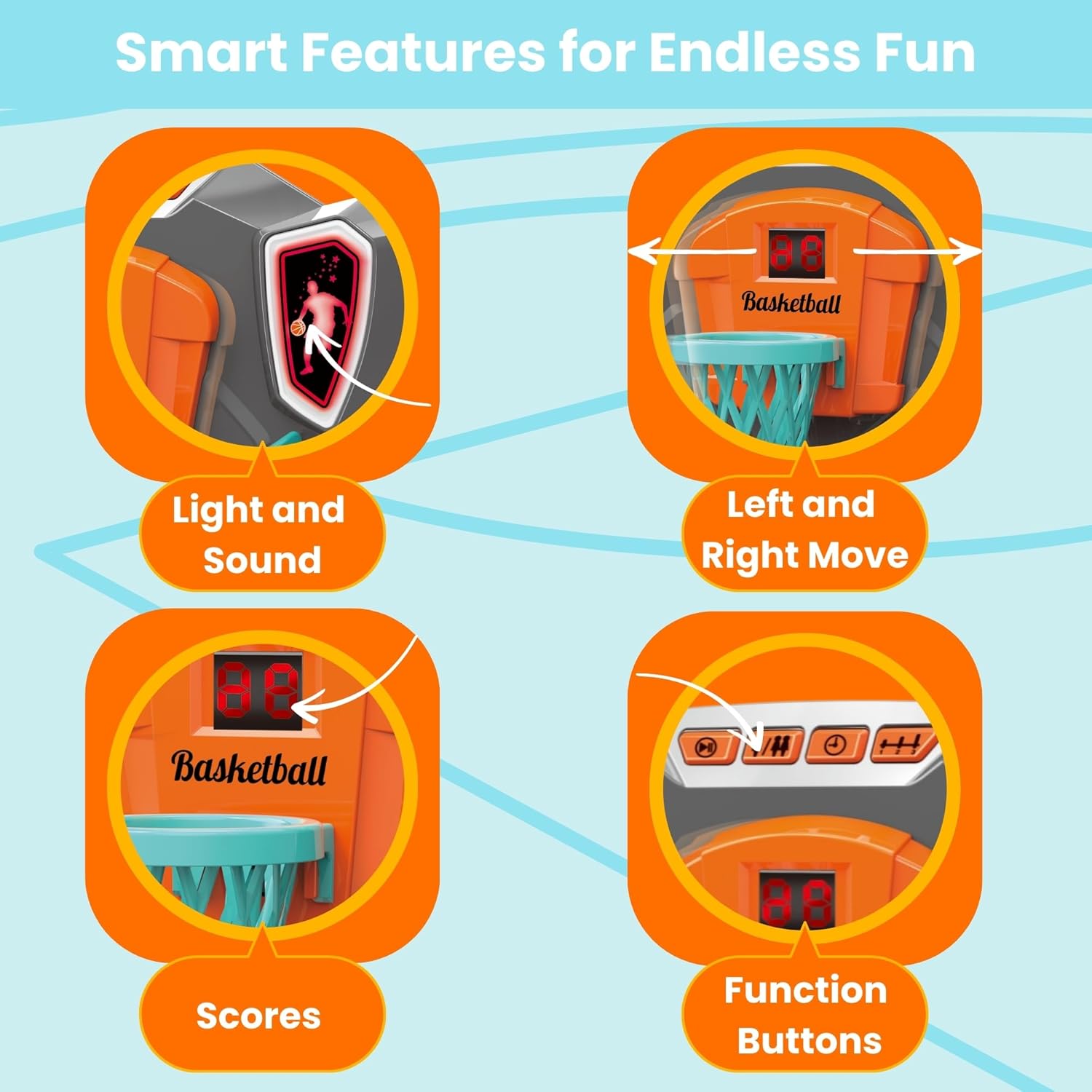 Transform any space into an exciting basketball arena with this interactive tabletop basketball game! Designed for kids ages 3 and up, this mini basketball game helps develop hand-eye coordination, reaction time, and motor skills through fun, competitive play. Featuring an electronic basketball game scoreboard, a spring-loaded shooter, and a desktop basketball hoop, it delivers an authentic arcade experience. Protective mesh guards keep the ball in play, ensuring nonstop action. Built for durability, this basketball toy offers endless entertainment, whether playing solo or challenging friends. Its compact, portable design makes it perfect for basketball games for boys 8-12, family game nights, or fun at home. Easy to set up and store, this table basketball game is a great gift for birthdays and holidays. A must-have for kids who love basketball shooting games, tabletop arcade games, and skill-based play. Enjoy fast-paced fun with this exciting basketball board game!