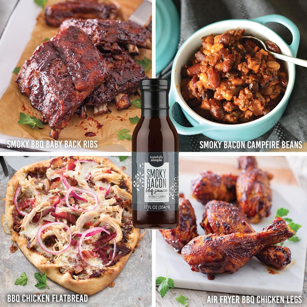 Our signature BBQ sauce sizzles with the hearty, mouth-watering flavors of bacon, molasses and spices. So much more than a grilling sauce, Smoky Bacon BBQ Sauce is the succulent secret to scrumptious baked beans, sloppy joes and pulled pork, too!Product Ingredients:Tomato paste (tomatoes, salt, citric acid), molasses, brown sugar, vinegar, Worcestershire sauce from concentrate (vinegar, molasses, corn syrup, water, salt, caramel color, garlic powder, sugar, spices, tamarind, natural flavor), soy sauce (water, soybeans, wheat, salt), salt, rice starch, natural smoke flavor, chipotle powder, parsley, natural bacon flavor, garlic, onion, chili powder, spice. RECIPE: Smoky BBQ Sliders This simple and delicious Smoky BBQ Sliders recipe is perfect for making ahead of time. Active Time: 30 minutes Total Time: 30 minutes Recipe Ingredients: 1½ pounds lean ground beef 1 (2.8 ounce) container French fried onions 1 teaspoon Ultimate Steak Seasoning ¼ cup Smoky Bacon BBQ Sauce 6 slices American cheese, cut into quarters 12 slider buns 12 tomato slices 12 small lettuce leaves Directions: 1. In large bowl, combine first 4 ingredients. Form into 12 patties. 2. Prepare grill to medium heat. Place patties on grill. Grill, turning once, until internal temperature reaches 165°F on an instant-read food thermometer, about 6-8 minutes. Top with cheese. 3. Place burgers on buns with lettuce and tomatoes. Makes 6 servings.