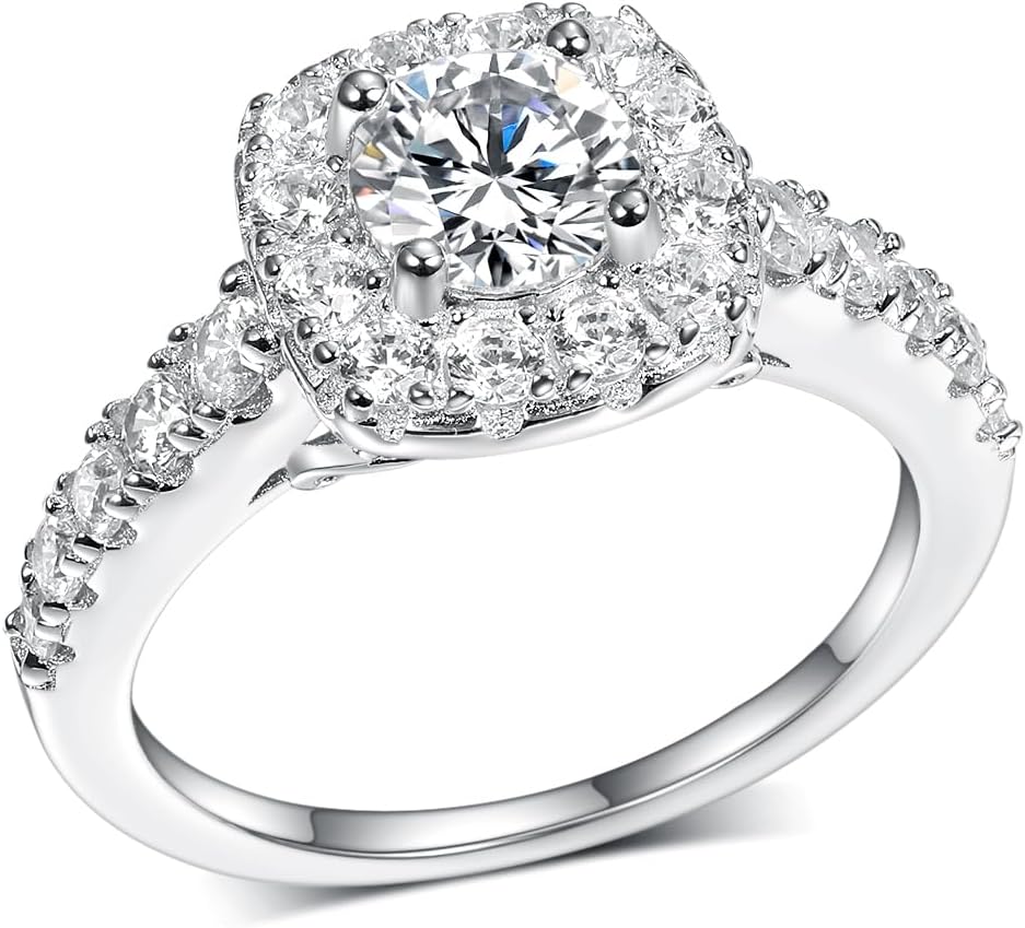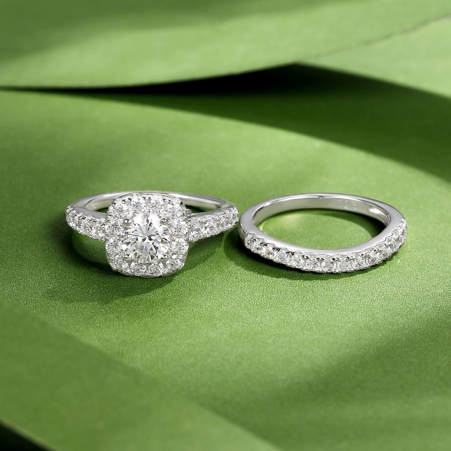 • 925 Sterling Silver Halo Wedding Rings Set- 1ct. CZ wedding rings in high quality 925 sterling silver, white gold polished. Round brilliant-cut cubic zirconias, lead-free, eco-friendly and hypoallergenic setting.