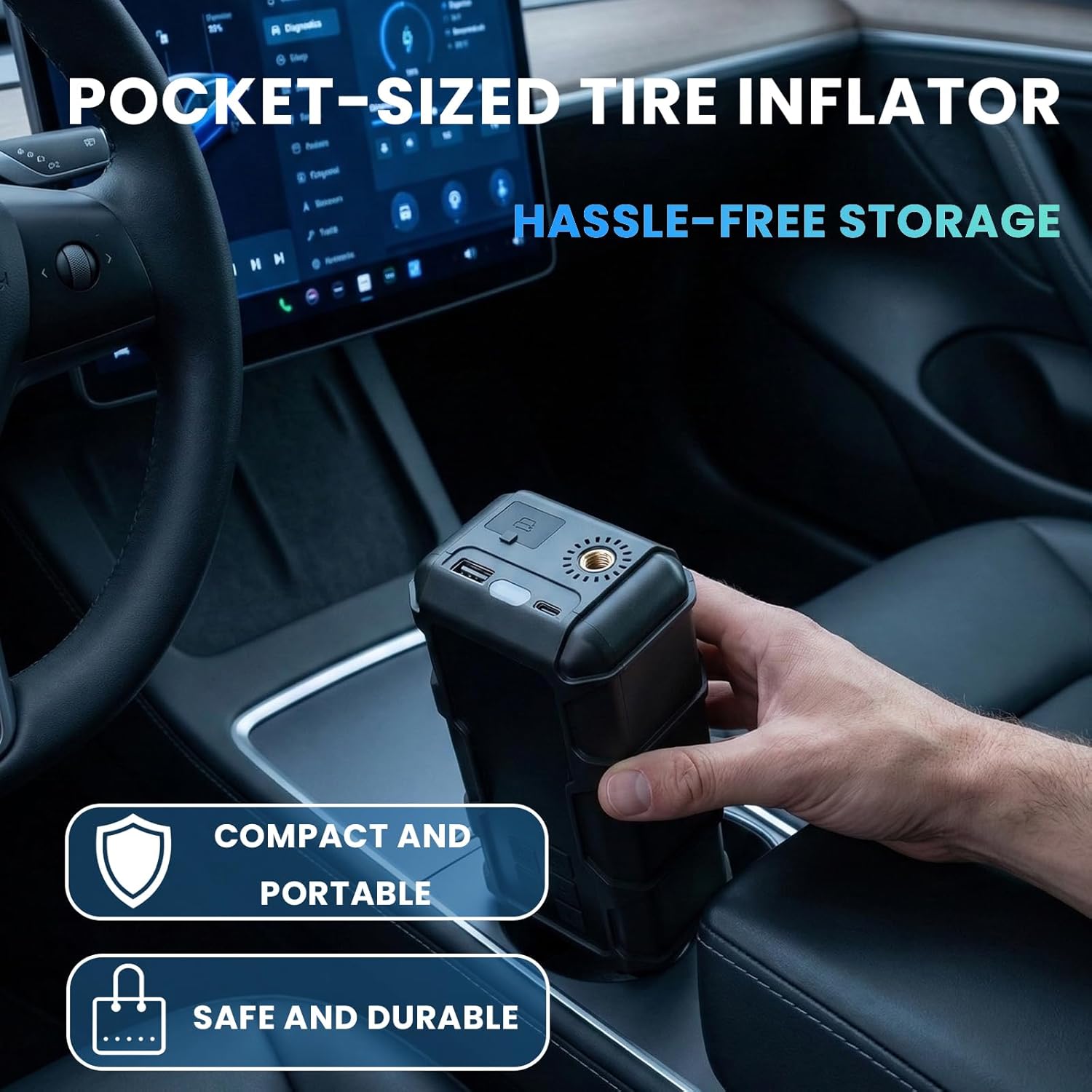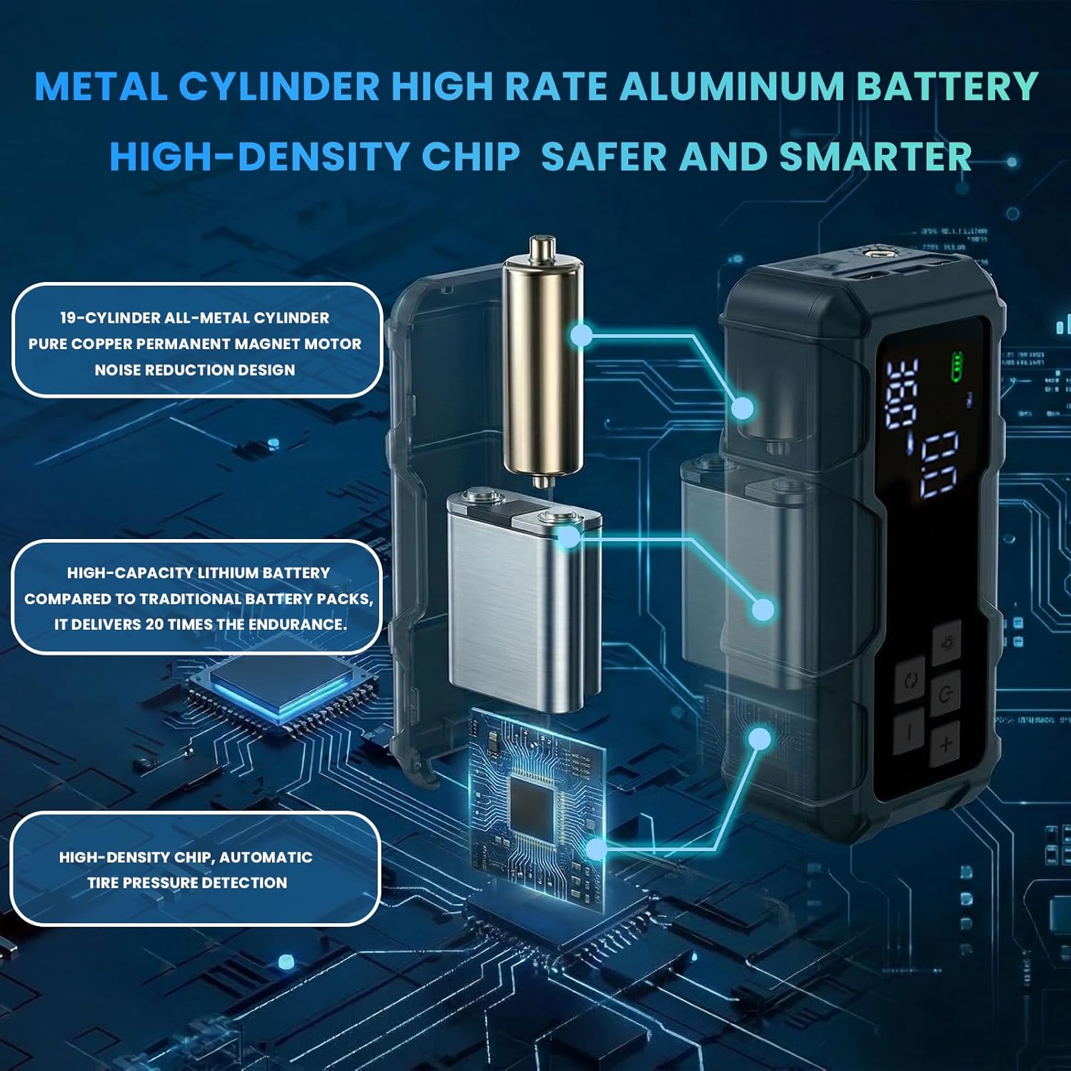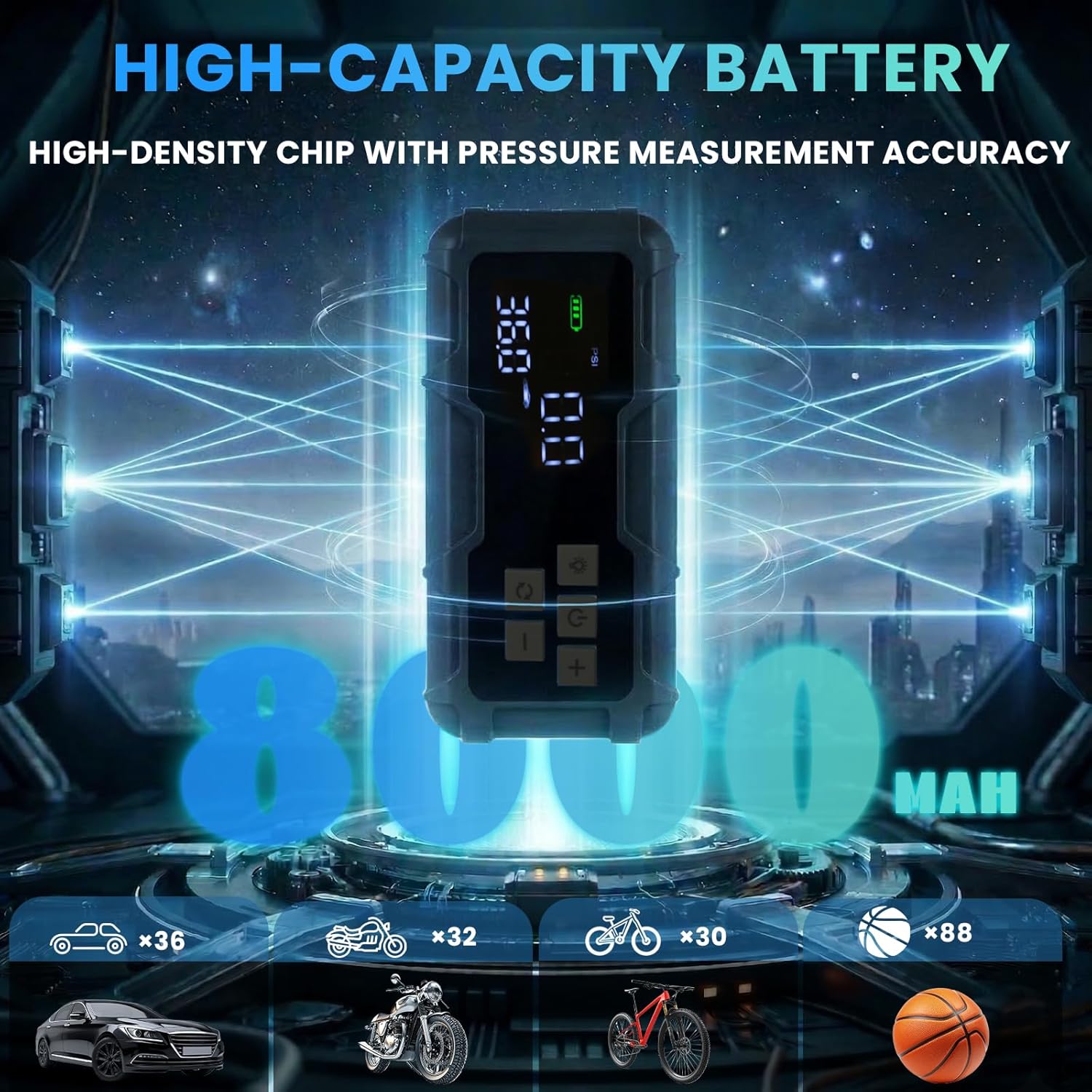 Product Description: High-Performance Wireless Air Pump: Powerful Performance, Precise Control—Your All-in-One Portable Inflation Expert 1. Professional-Grade Power Core, Remarkable Efficiency The tire inflator portable air compressor features a built-in powerful 19-cylinder 390 motor with a straight-through design, utilizing an advanced 16V high-voltage platform. This delivers an impressive airflow of 19-21 liters per minute, with a starting current of 480A and a peak current of up to 960A. It can fully inflate a standard car tire in just 6-7 minutes, effortlessly handling everything from sedans to SUVs, making inflation faster and more efficient than ever before. 2. Extended Run Time & Dual Power Solution The tire inflator portable air compressor is equipped with four high-quality 2000mAh high-rate (60C-120C) polymer lithium batteries, offering abundant energy and strong discharge capability. On a single full charge, it can complete at least four car tire inflation tasks. Its unique circuit design supports simultaneous charging and operation, eliminating range anxiety entirely. Even more conveniently, it doubles as a 5V/2A power bank, enabling emergency charging for your phone and other devices via USB—truly a multi-purpose tool. 3.Smart Landscape Display for Intuitive Operation We've revolutionized the traditional air pump experience. Featuring a unique horizontal mirrored display with a striking visual contrast, it exudes a sleek, high-tech aesthetic. The screen supports dual-mode display, providing real-time, precise tire pressure readings (switchable between PSI, BAR, KPA, and KG/CM² units). A dedicated battery percentage icon clearly shows remaining power, complemented by clear mode indicator lights to ensure every operation is accurate and error-free. 4. Full-scenario modes and precise auto-stop technology The tire inflator portable air compressor comes pre-programmed with multiple intelligent inflation modes, compatible with cars, motorcycles, bicycles, basketballs, soccer balls, and more. You can also freely set precise pressure values in manual mode. Equipped with a high-precision pressure sensor, the device automatically stops when the preset pressure is reached, effectively preventing over-inflation. This ensures safety and peace of mind, making it easy to use even for beginners. 5.Craftsmanship and User-Friendly Details The compact unit measures just 170*71*65mm and weighs only 590g, making it lightweight and portable—easily stored in a car glove compartment or backpack. A soft-glow side-mounted LED light illuminates the work area clearly in nighttime or dimly lit garages. The durable shell combined with a sleek mirrored panel ensures ruggedness and drop resistance while showcasing exceptional taste.