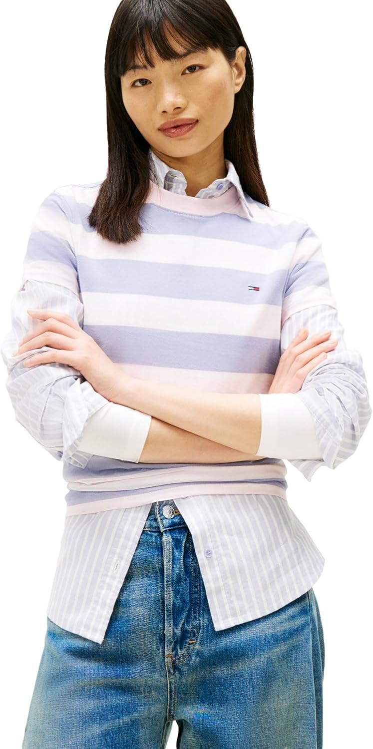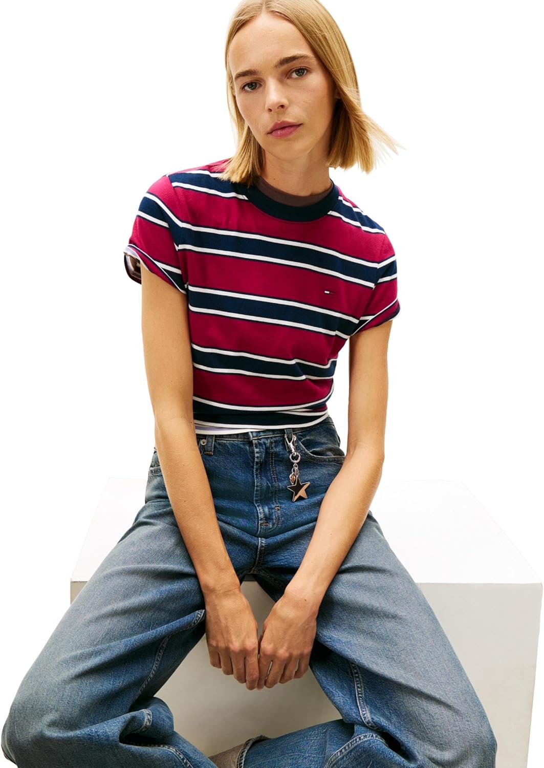 Introducing Tommy Hilfiger's iconic women's t-shirts, featuring the signature embroidered flag logo and crafted from 100% cotton for a soft hand feel and comfortable fit. These graphic tees are the epitome of everyday style, perfect for effortlessly elevating your casual look. Durable enough to withstand serious wear, Tommy Hilfiger's graphic t-shirts for women are breathable, crisp, and lightweight, ensuring you stay cool and comfortable every time you slip them on. The special wash process gives these crewneck graphic tees their softness, making them a solid basic option for any wardrobe. Pair them seamlessly with your favorite Tommy Hilfiger shorts, pants, jeans, or jackets for versatile styling options suitable for any occasion, whether it's a casual outing or a formal event. Ideal for daily wear, work, school, events, vacation, or sports, these women's shirts are a wardrobe essential. Treat yourself or surprise a loved one with this timeless piece, perfect for mothers, sisters, girlfriends, wives, daughters, or friends. Elevate your everyday style with the unbeatable quality and sophistication of Tommy Hilfiger's women's shirts.