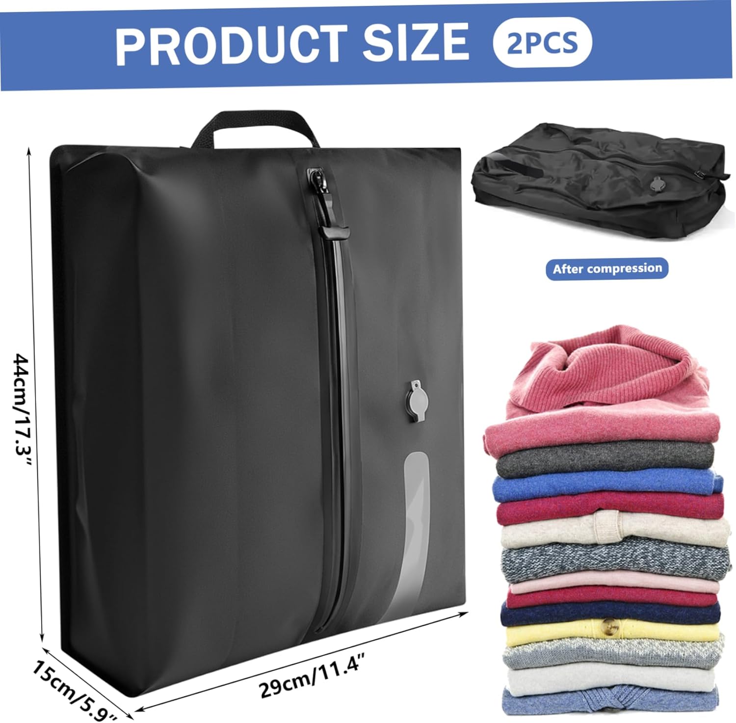 Description: Pack smarter and travel lighter with our complete Travel Vacuum Bag System. This 2-pack set revolutionizes packing by combining high-capacity 17L compression bags with a dedicated, cordless electric pump. Simply load your clothes, seal the heavy-duty T-shaped zipper, connect the custom-fit pump, and watch as it extracts air in under a minute. The result? Your bulky items shrink by up to 60%, maximizing every inch of your suitcase. These bags are perfect for seasonal storage at home, compressing winter coats or extra bedding to free up closet space. The IPX7 waterproof rating and airtight seal ensure your belongings stay dry and protected from musty odors. The included pump is compact, USB-rechargeable, and features a built-in LED light for use in dim environments. Ditch the clutter and embrace efficient, organized packing for any adventure. Features:. -Color: Black. -Material: TPU composite fabric, 70D Nylon. -Size: 44x29x15 cm/17.3x11.4x5.9 inch. -Capacity: 17L. Note:Manual measurement, please allow slight errors on size.The colors may exist slight difference due to different screens. Package Including 2 * Vacuum Storage Bags1 * Pump