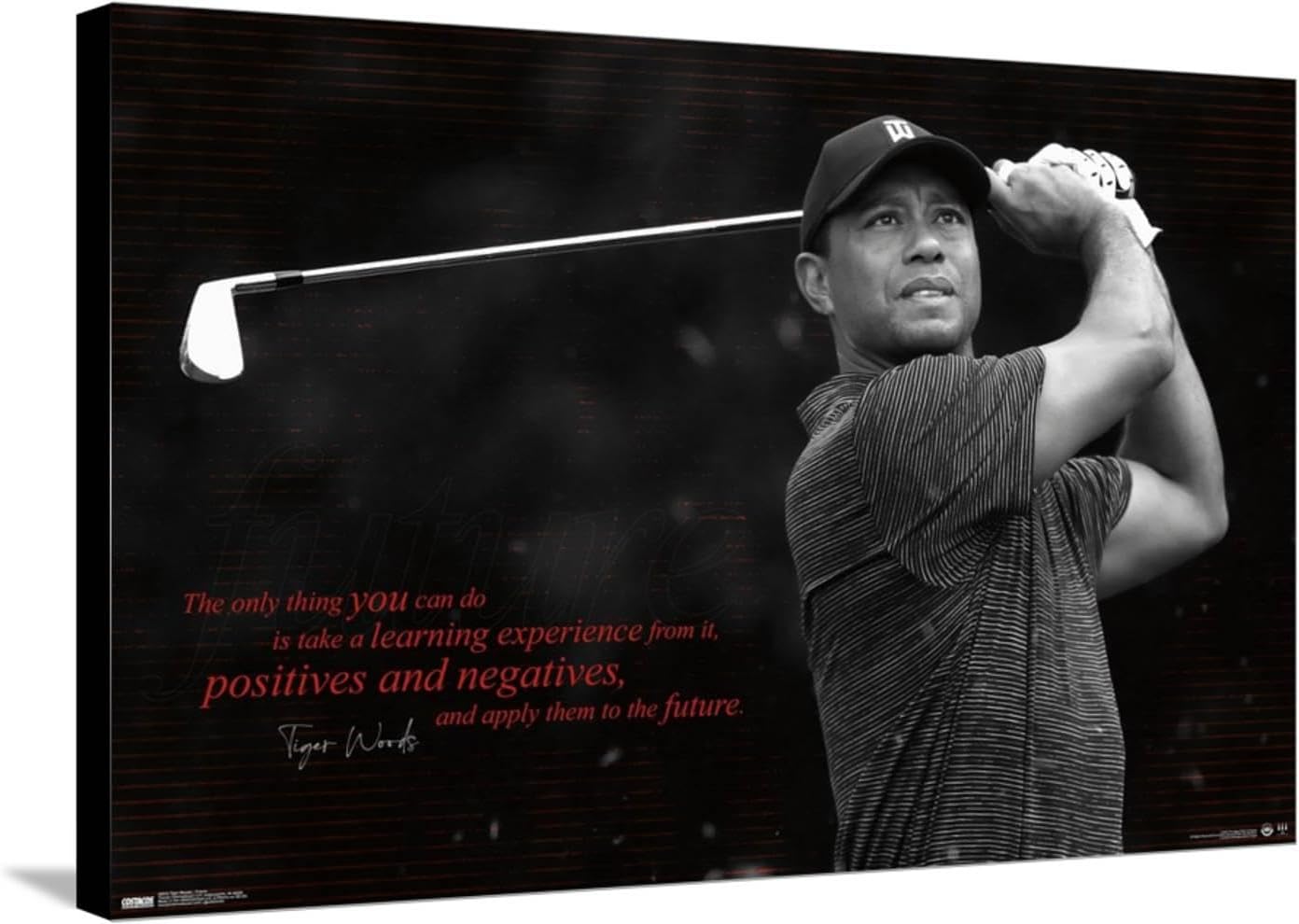 Elevate your walls with Tiger Woods - Future Poster Canvas Wall Art. Crafted with meticulous attention to detail, this stretched canvas poster print is a true masterpiece. We believe in using only high-quality materials, which is why we use artist-grade canvas and 1.5-inch stretcher bars made from all natural poplar wood. The blurred-edge canvas wrap creates a reflection-like appearance, enhancing the original image without any loss of quality. Our professionally stretched canvases are printed with latex inks, ensuring vivid colors that resist fading and humidity. Our high-quality canvases are wrapped around poplar wood, providing exceptional warp-resistance which maintains the shape of the canvas over time. We use staples to secure the canvas tightly, guaranteeing a taut and perfectly stretched surface. With a finished size of 14.725" x 22.375" , our Canvas Wall Art brings sophistication and beauty to any room. Transform your space with Officially Licensed wall art featuring all your favorite brands, from movies, shows, and music, to anime, video games, sports teams, and more! Canvas Wall Art from Trends International is the perfect addition to any fan's wall art collection.