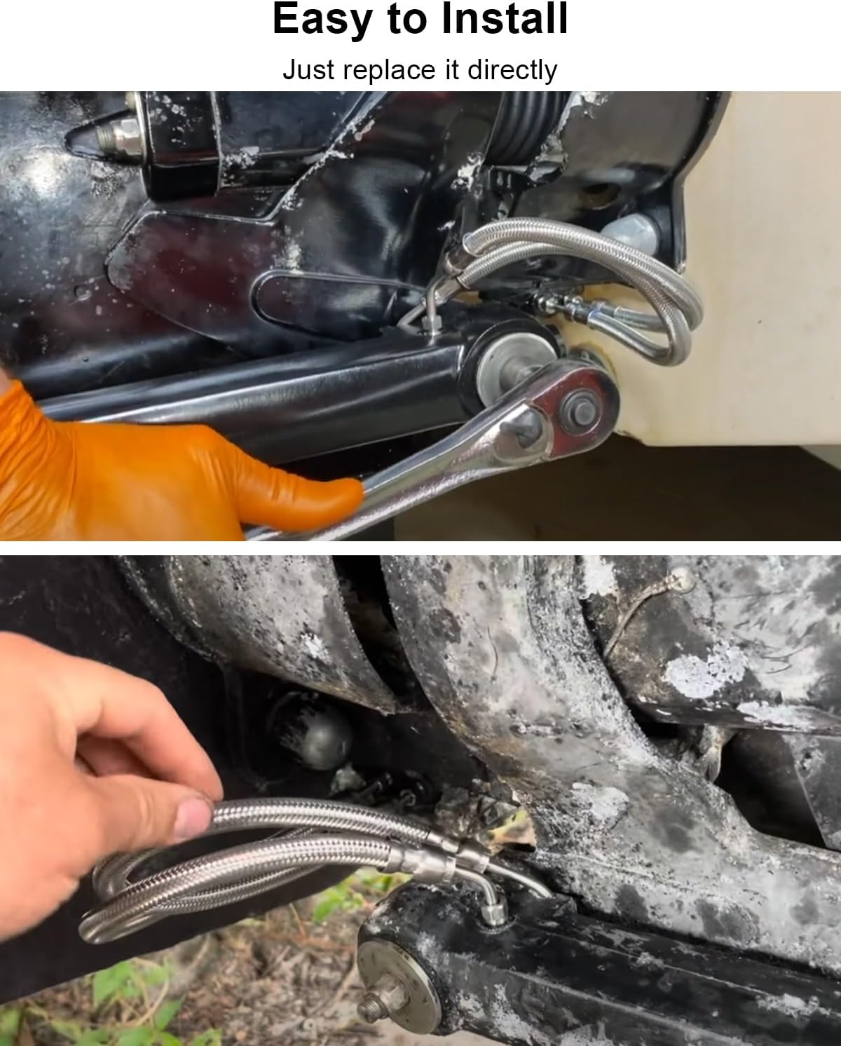 Compatible Models: Fit for Mercruiser Alpha One (equipped with 15-9/16 "Trim Cylinder) Fit for Bravo 1, 2, 3, X series design Replacement Part Number: Replace 32-864589 Replace 32-864588 Replace 32-99904Q (2 pack) New Material Upgrade: High strength and corrosion resistance: high-strength steel support and corrosion-resistant materials are used, suitable for high pressure and harsh environments. Pressure-resistant and explosion-proof design: enhance sealing, reduce the risk of leakage or bursting, and ensure system safety. Adapt to extreme environments: salt spray, high and low temperature resistance, suitable for complex conditions at sea. Optimize hydraulic flow: improve system response speed and make turbine adjustment smoother. Function: Efficiently connect the hydraulic pump and hydraulic cylinder to ensure smooth transmission of hydraulic oil. Adjust the turbine speed and direction to control the speed and heading of the ship. Stabilize the ship's attitude, reduce shaking, and improve sailing comfort. Installation: The installation is extremely simple, you can refer to the installation video on YouTube to save more money!