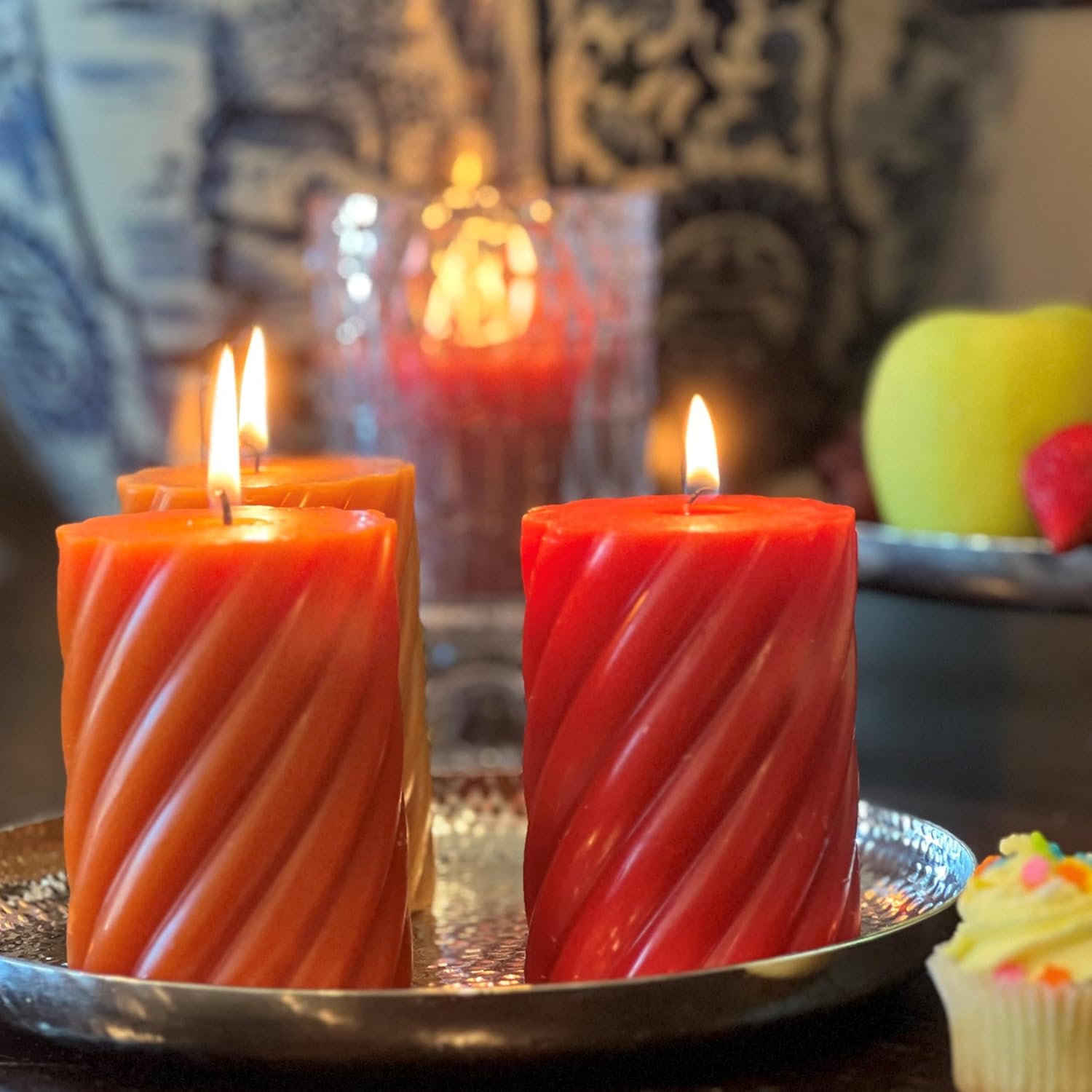 Add a swirl to your decorating playbook and make a stunning statement with these twisty-wrap pillars. An outstanding addition to your home decor playbook, use them to stylishly update favorite candle holders with a modern look. Light them up and entertain with the welcoming glow of candlelight. Sculptural spirals for your table, these twisters are made of fine paraffin wax that produces a beautiful golden flame. Well sized, each piece measures as follows: 2.75 D x 4 H inches, .75 lbs. (7 D x 10 H cm, 320 grams) Unscented, these pillar candles have a burn time of 45 hours. Perfect hostess gifts, these chic candles are sure to impress. On trend, use these twisty pillars to compliments a wide variety of decor themes, from country casual to coastal cool.