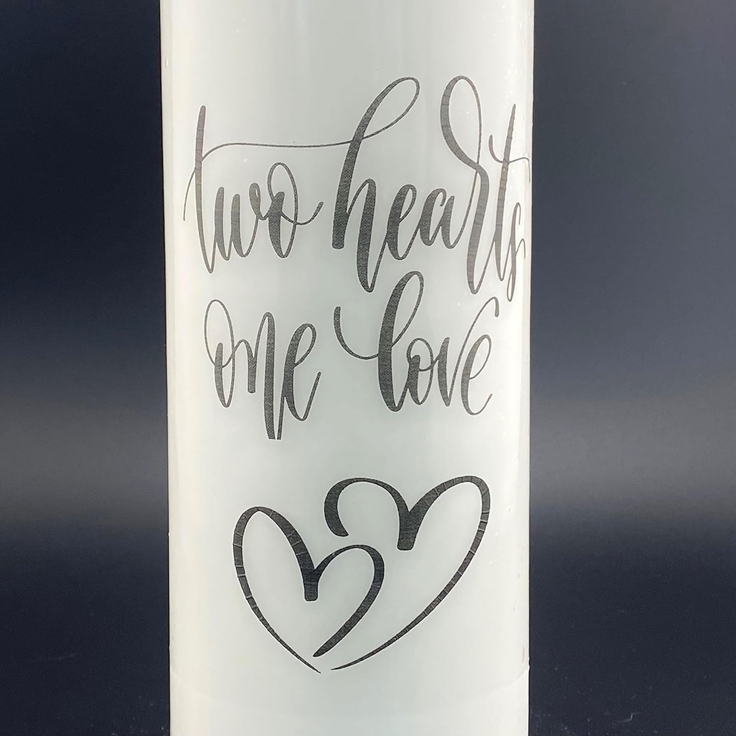 Beautiful white candle set can be used for a contemporary wedding unity candle, a unique home accent or a romantic gift. The hand drawn script reads, Two hearts, One love and is accented with hearts. The set includes a slow burning 9 inch pillar and a 10 pair of dripless tapers.