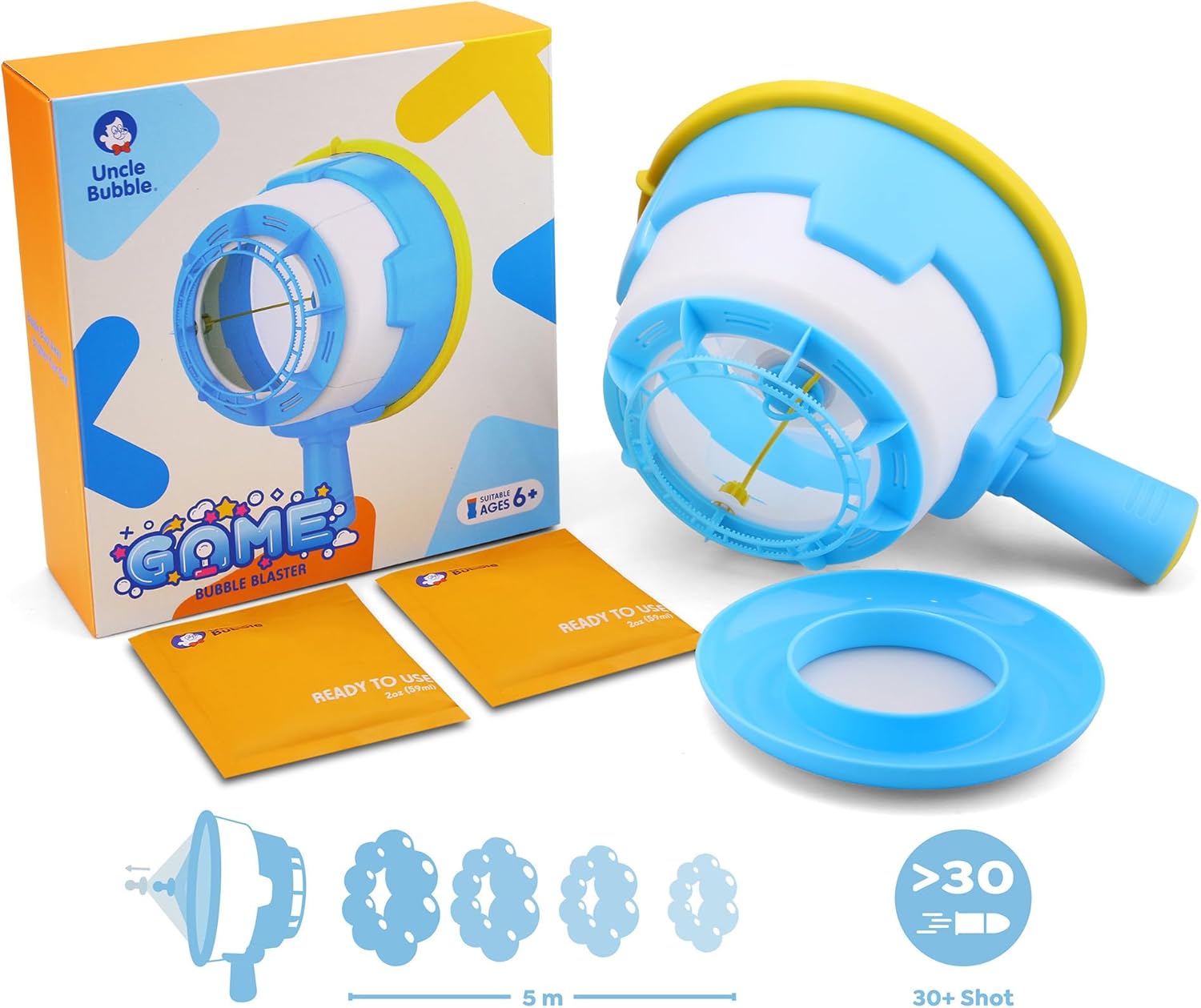 | Included Components | Bubble Blaster, Bubble solution 2oz x 2, Instruction x1, Solution Tray x1 |