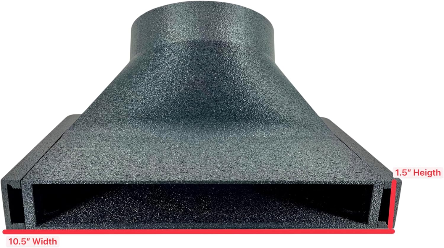 Have an amazing workspace, extra garage or HOA Rules you have to work around, and needing a way to vent your laser, portable ac or other appliances to the outside without drilling a massive hole in the wall? INCLUDES HOSE CLAMP & ADAPTERS FOR 4IN, 5IN, 5.9IN & 6IN HOSES! This duct converts a 4in, 5in, 5.9in Portable AC or 6in standard hvac hose to the outside under your existing garage door or window by creating a flat bottom and spreading a circle airflow into a longer narrow wedge of air. THIS KIT INCLUDES ALL THE ACCESSORIES SO YOU KNOW YOU HAVE THE RIGHT SIZE AND VOLUME OF AIR MOVEMENT FOR YOUR APPLICATION Assembly Instructions for the 2x4 Extended Airflow Version can be found here https://leafgreensolutions.com/assembly-instructions Works well for a temporary or permanent installation. Ducting can be spray painted to match trim for a more discrete look. Measures 10.5" in width (Extended Version measures 21" in width) 1.5" Tall in the front to align with a 2x4 for thickness. 10.5" in depth front the front to the back Tip: Most garage doors have a disconnect from the motor which allows free motion by hand. For Temp installs, this will make closing the garage door on the boards/ducting easier. If more of a permeant install, keeping the motor engaged will help prevent easy outside lifting of the door.