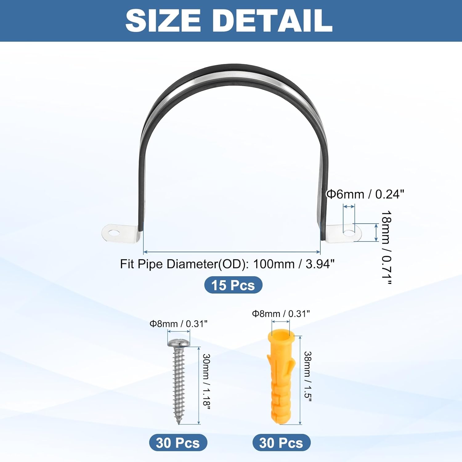 Description:[Material]: The pipe strap clamp features 304 stainless steel construction for corrosion resistance, paired with an inner rubber lining that absorbs vibrations and reduces noise while protecting pipe/cable surfaces from scratches. The U-shaped design ensures even pressure distribution for long-term secure fastening. [Function]: This U bracket pipe clamps system provides superior grip stability with its full-wrap structure, preventing loosening under vibration. Pre-drilled 4mm holes allow quick wall/board mounting with included expansion plugs and screws, making it good for organizing messy pipelines or cable bundles in various settings. [Easy to use]: Simply mark the location, drill holes, insert expansion bolts (for concrete/brick walls), align the clamp with the pipe/cable, and tighten the screws. Easy to operate and tool-free installation.[Multiple Use]: The rubber pipe straps are widely applied to fix cables, wires, pipelines of water, fuel, oil and gas mediums in petroleum, chemical industry, household, metallurgy, ships, and power hydraulic systems, indoor and outdoor, good for maintenance crews, electricians. Specification: Material: Stainless Steel and Rubber LinerFit Pipe Diameter(OD): 100mm / 3.94 inchSize: 18x0.5 mm / 0.71x0.02 inch(W x T)Hole Spacing: 6mm / 0.24 inchScrew Size: 30x8 mm / 1.18 x 0.31 inch(L x W)Expansion Plugs Size: 38 x 8 mm / 1.5 x 0.31 inch(L x W)Package Contents: 1 Set x Pipe Strap Clamp included 15Pcs Clamps, 30Pcs Screws, 30Pcs Expansion Plugs