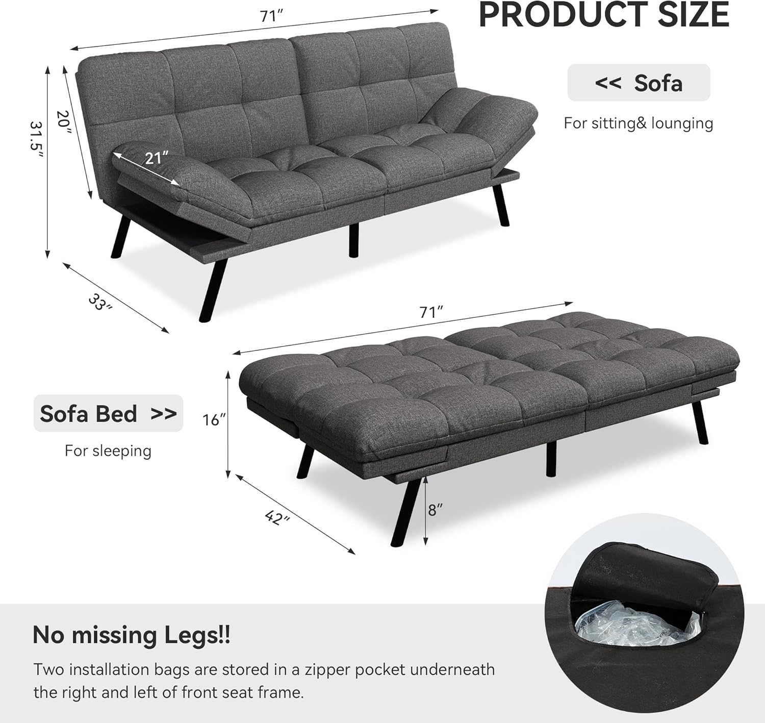 | Assembly Instructions Description | The futon bed is easy to assemble and comes with simple installation instructions, you can easily assemble it in 15 minutes. |
