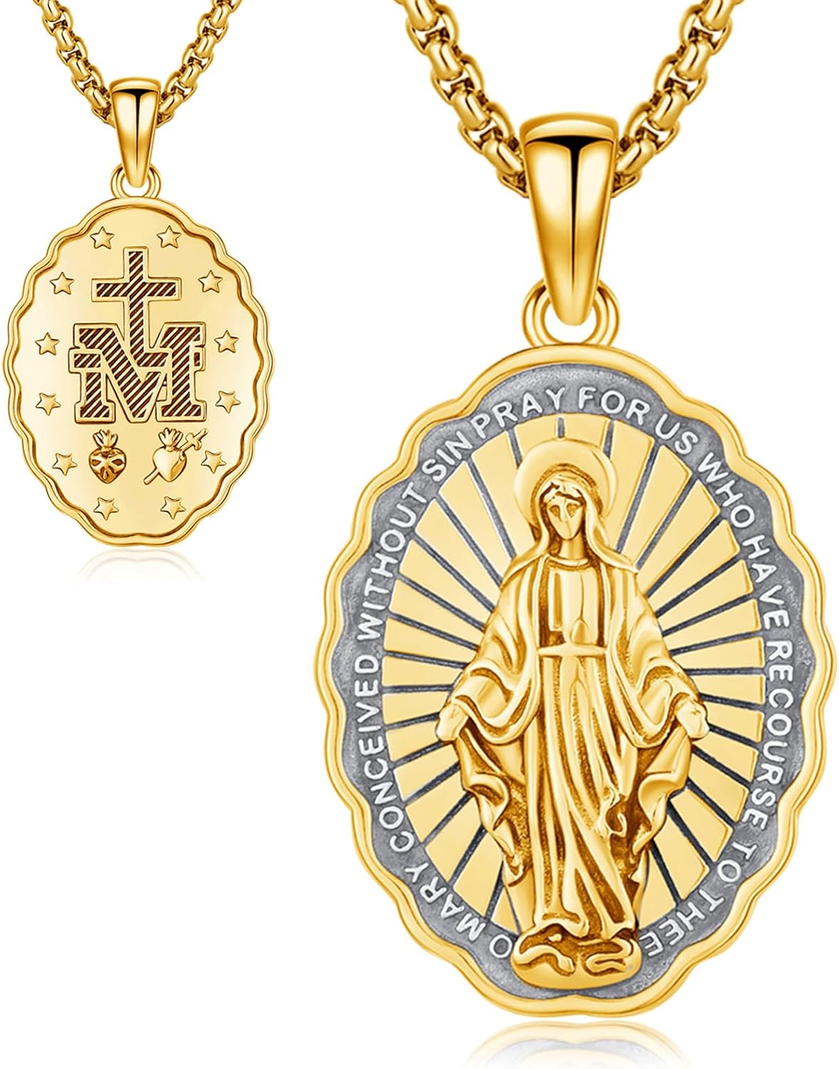 Elevate your faith and style with this miraculous medal catholic pendant necklace crafted from 925 sterling silver. A timeless symbol of devotion, this exquisite pendant features intricate detailing that captures the essence of the Blessed Virgin Mary. Designed for both men and women, this necklace is a beautiful accessory to wear daily or on special occasions. The high-quality sterling silver construction ensures durability and longevity, while the polished finish lends an elegant touch. Whether you're seeking spiritual guidance or simply admiring the artistry, this miraculous medal pendant is a meaningful addition to your jewelry collection. Embrace your faith with this stunning piece that combines religious significance and sophisticated design. Features: Miraculous Medal Medal pendant is made of S925 sterling silver and the chain is made of stainless steel. The Miraculous Medal Medal necklace is of qualified quality and does not contain nickel, lead, or cadmium Miraculous Medal Necklace is said to be a powerful Catholic symbol of faith and divine protection CHAIN LENGTH:22"+2" extender =61 cm | PENDANT WEIGHT:Approximately 5.2 Grams | PENDANT HEIGHT 1" = 25.5 mm | PENDANT WIDTH: 0.81" =20.5 mm Comes with the charm gift box,perfect for any gift giving occasion, great Christmas gifts,Thanksgiving gifts,graduation gift,birthday gift,congratulation gift,vocation gifts,mother day gift,anniversary gift or business gift for women,mother,wife,business partner Miraculous Medal -the perfect gift for you, your lover, friends, father, mother, on your birthday, wedding, Mother's Day, Father's Day, banquet, Thanksgiving Day, Valentine's Day Christmas, Halloween Package : Package with gift box,ideal gift for Wife,Mother,Grandmother,Daughter,Sister, Aunt, Mom,Grandma,Nana,Granny as Birthday Gift,Wedding Anniversary Gift,Christmas Gift,Valentine's Day Gift,Mother's Day Gift