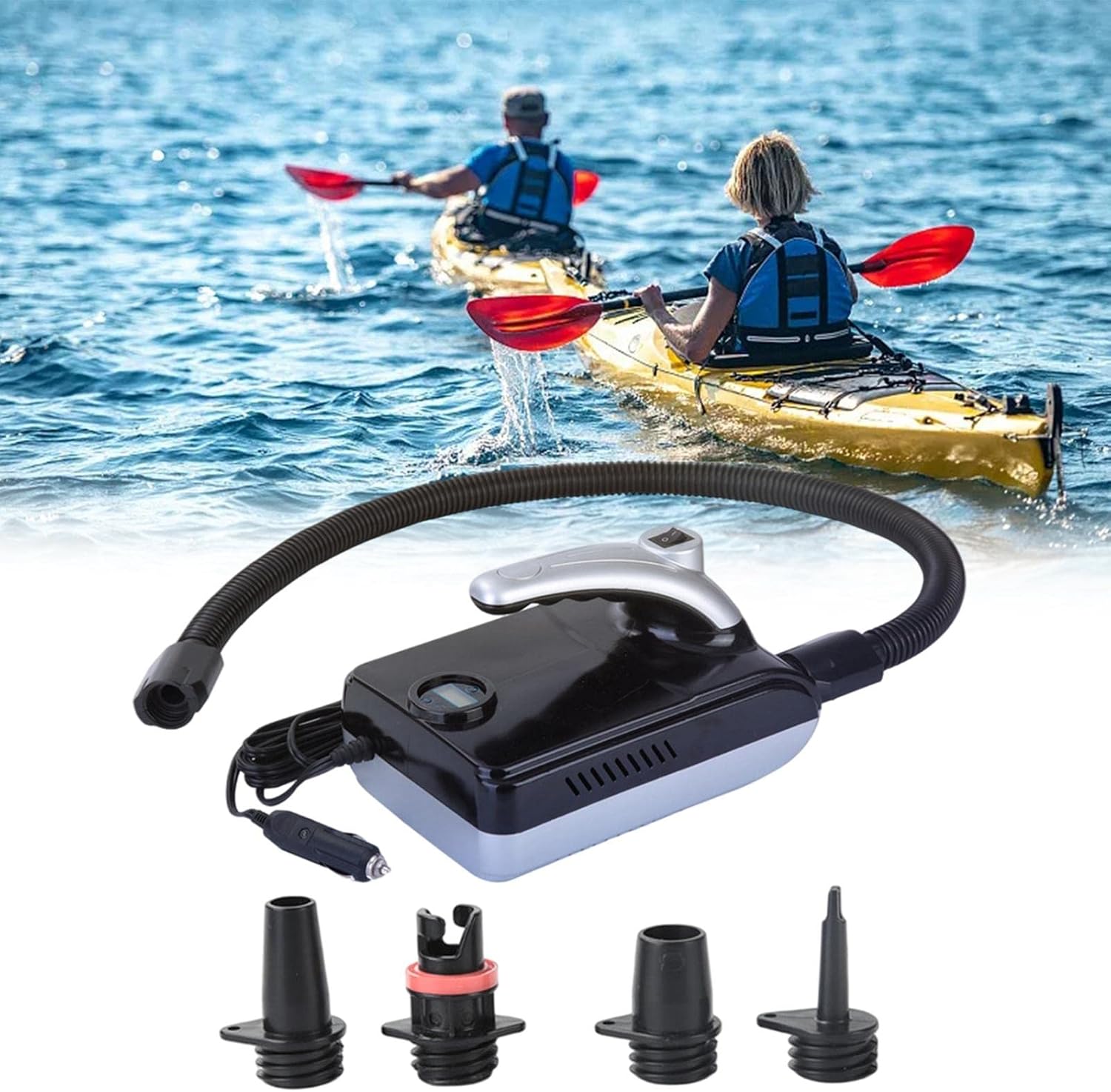 Description: - Copper motor with high performance, quickly inflates from 0-20 PSI in minutes with switch between PSI and BAR. - Digital screen and button controls for easy , easy to set the desired pressure. - Automatically shut off when predetermined pressure is reached to prevent over inflation. - Can be powered via outlet with the cigarette accessory jack. - 4 nozzles to work with different , no need to buy extra nozzles. - Flexible long hose is detachable for space saving. - Ergonomic handle makes it convenient to carry.Specification: - Material: - Power: 110W - : 12V - . Current: 10A - Noise: ≤85db - Pressure: . 20PSI - Power cable length: 3M - Power Type: DC - Inflatable tube length: 98cm - Cylinder size: 28 cylinders - Air : 25L/min - Main application scope: surfboards, kayaks, inflatable boats, rubber boatsSize Chart:22x15.5cm/8.66x6.10inchPackage Includes:1 X Electric Air Pump4 X NozzleNote:1. Please allow slightly error due to manual measurement.2. Due to the difference between different monitors, the picture may not reflect the actual color of the item.3. Wish you a wonderful online shopping!