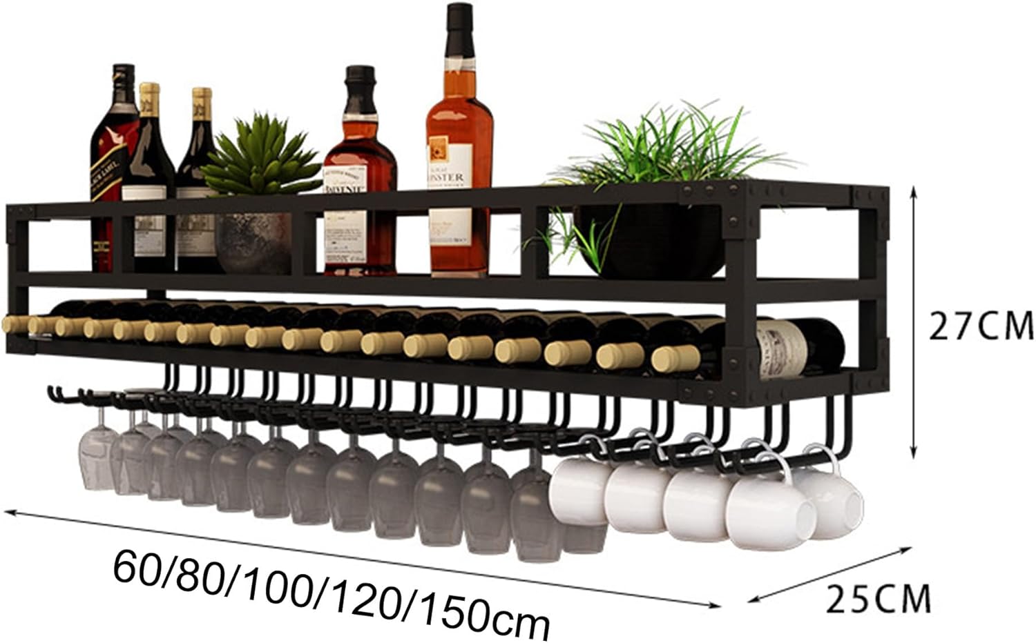Beautiful wine rack for every styleModern style wine bottle rack is also a perfect home decoration for you. You can hang it in your kitchen, dining room or your home wine bar. Give your house a classy touch.Name: Wall Mounted Wine Rack with Wine Glass Rack Bar Shelves with Wine Glass Holders Hanging Under Shelf Wine Bottle Storage Holder Material: IronMetal structure process: weldingFurniture structure: frame structureColor: black/goldSize:60*25*14cm , 80*25*14cm , 100*25*14cm , 120*25*14cm➽Tips1. About color---------There may be color difference due to display screen or shooting light, please understand!2. About size---------Due to different measurement methods, there may be an error of 1~2cm, please understand!3 About service---------Please identify the store“MMCJIES”,We can ensure product quality and after sell.If you have any questions, please feel free to contact us, we will reply you within 24 hours.