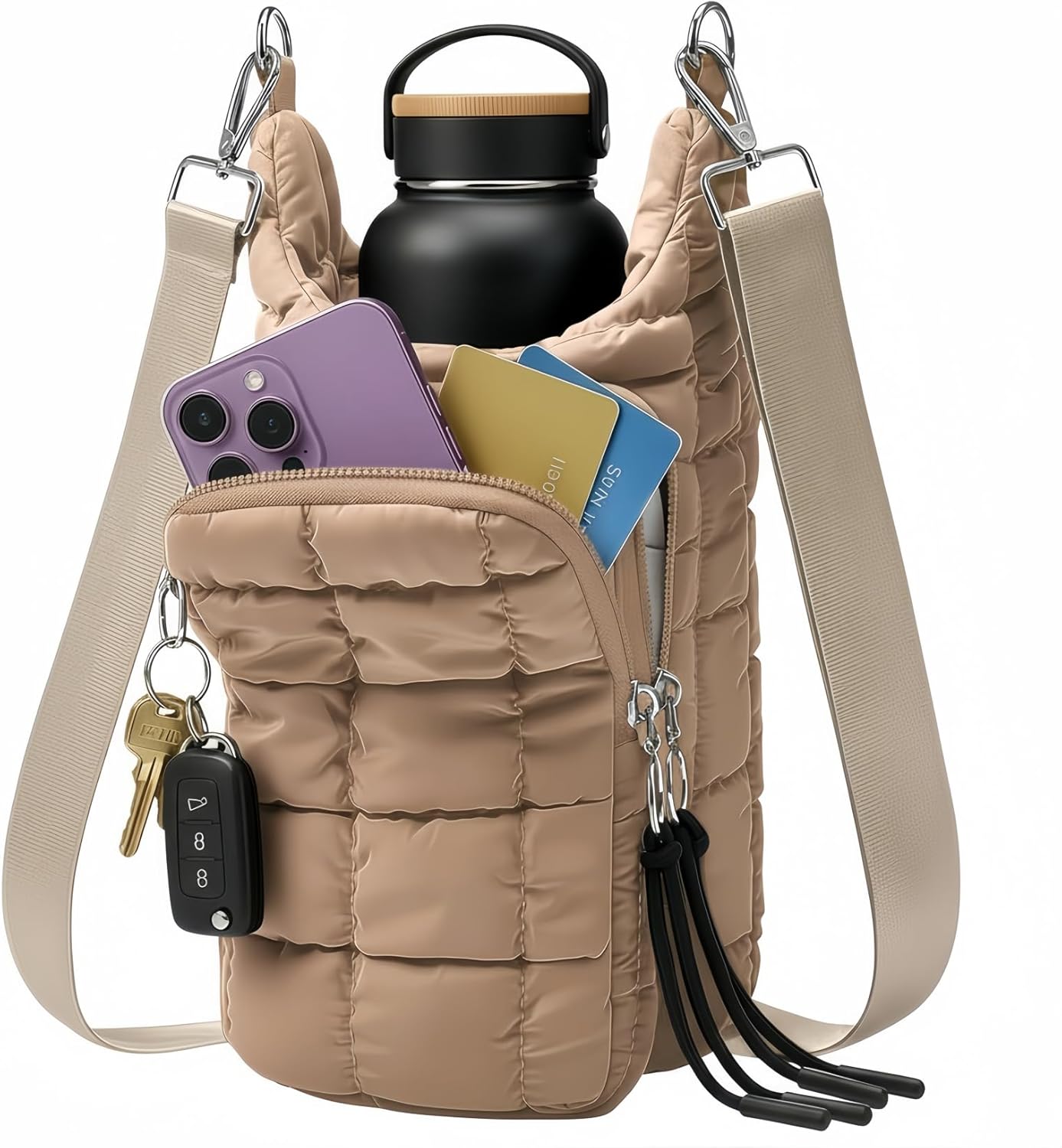 Stay hydrated in style with Quilted Puffer Water Bottle Holder with Strap Crossbody Bag for Women—a perfect blend of fashion, function, and protection for your active lifestyle. Made from premium down-proof fabric and padded with waterproof, down-filled cotton, this puffer-style bottle carrier offers excellent resistance to moisture and impact while remaining soft and flexible. Your water bottle stays protected from everyday bumps, scratches, and splashes. Designed specifically for 40oz bottles without side handles, the crossbody puffer bottle sling measures 5.12" x 5.9" x 10.63" to provide a snug, secure fit that helps reduce movement and prevent spills. (Smaller bottles may shift slightly during activity.) Organization is effortless with multiple thoughtfully designed compartments: A phone pocket that fits devices up to 6.7 inches A front zipper pocket for quick-access items Inner card slots for cards or coins A key lanyard to keep your keys secure and easy to find The adjustable 24–47 inch strap allows you to wear the bag crossbody or over the shoulder for personalized comfort. Whether you're commuting, hiking, cycling, traveling, or running errands, this bottle holder keeps your hands free and your essentials organized.
