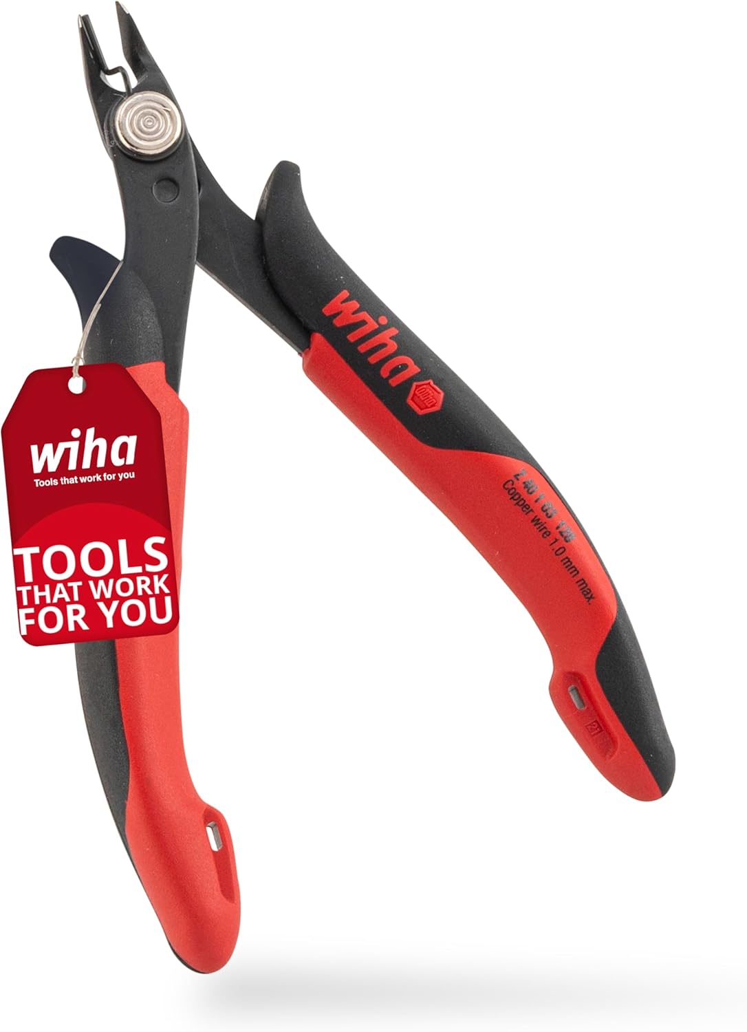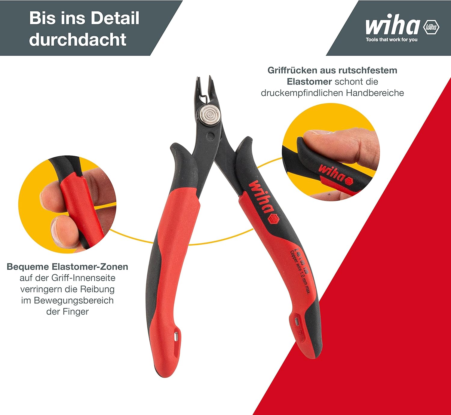 Head shape: narrow, pointed head. Design: blade without bevel for absolutely flush cutting. With opening spring and catch device for cut wire ends. Material: C 70 special tool steel. Application: For absolutely flush cutting of soft wires in hard-to-reach areas in electronics.