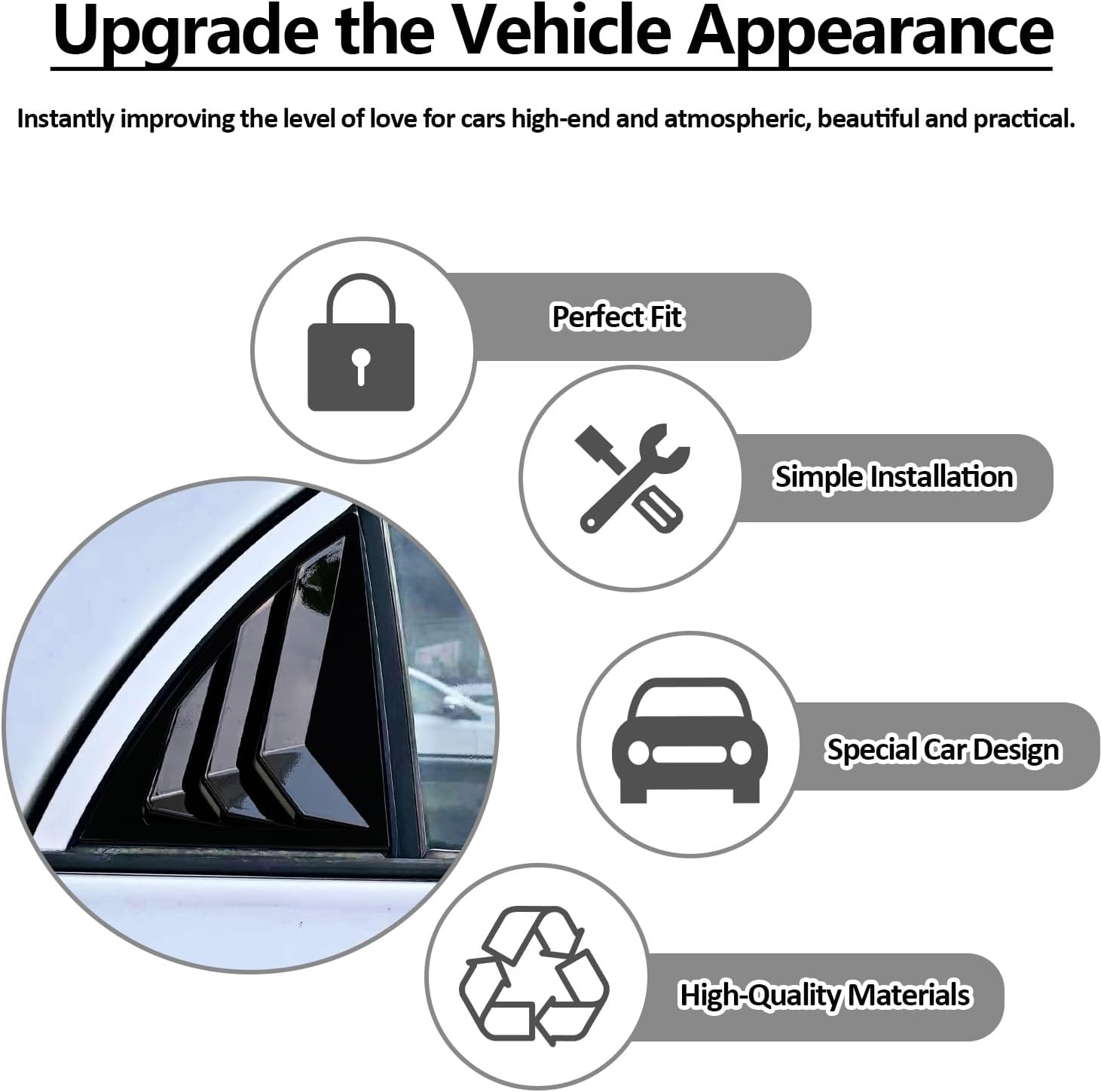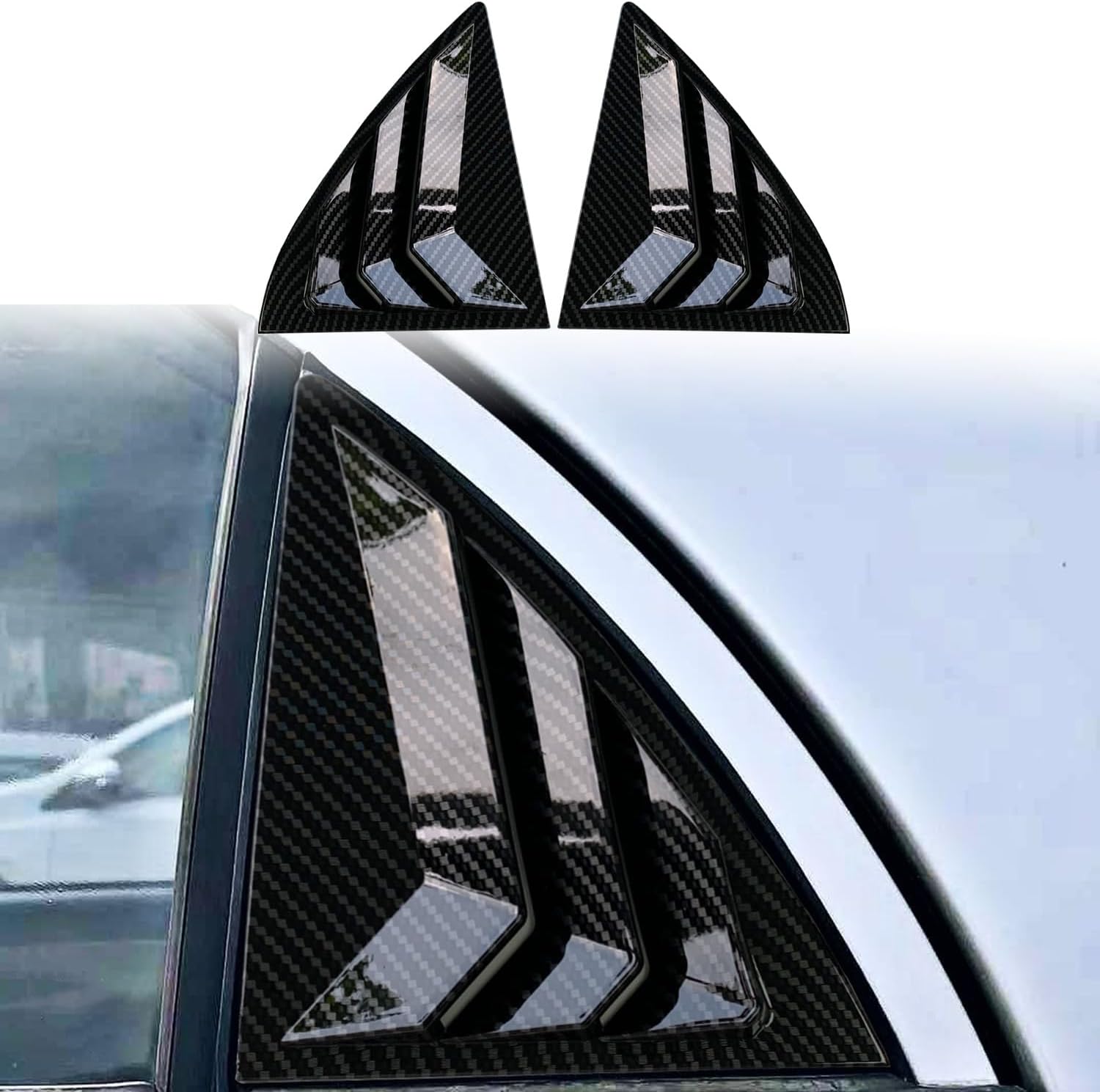 [Compatible information] The rear side window louver kit fits for Toyota Corolla GL 2009 2010 2011 2012 2013 models perfectly, can't fit for other model. [Product Parameters] Condition: Brand new Material&Color: High Quality ABS Material Bright Black (Carbon Fiber) Package Include: 2 PCS/SET(both sides) [model Feature] 1.Crafted with precision, these louvers are the perfect blend of style and functionality.Using this blind will give your car a sportier look. 2.The product is easy to install, convenient and does not damage the car body, and can be removed at any time without leaving any traces. The custom design ensures seamless integration with your car, making your car look cool and stylish. 3.Made of high-quality ABS plastic, it can cover existing scratches and prevent your car from being scratched by nails and keys. The material is hard, durable, corrosion-resistant, waterproof, and resistant to high and low temperatures. 4.They help protect your interior from the sun's harmful UV rays, prolonging the lifespan of your upholstery and dashboard. [Installation Step] *Step1: Please clean the surface of your car to make sure no dust and water. *Step2: Place the rear side window louvers on the place where it needs to be installed and adjust it well. *Step3: Remove the tape plastic film. *Step4: After the product is pasted, press hard for 1 minute to ensure full contact of the surface. Tips:Use a hair dryer to preheat the adhesive part of the product to enhance the adhesiveness of the tape.