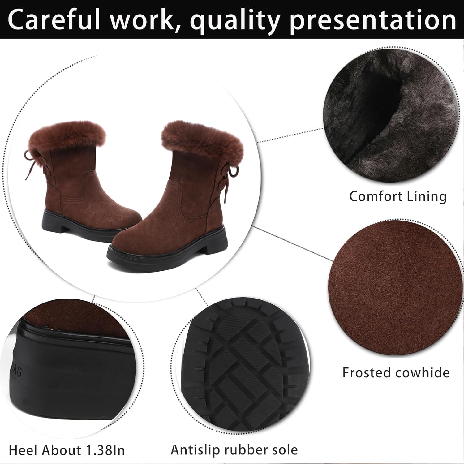 The design and production of each pair of women's suede platform chunky heel back lace-up snow boots goes through a strict process, from drawing to design to the final product based on careful and precise craftsmanship. Every visible and invisible detail, we hope to bring surprises to your life. Product name: Women's Suede Platform Chunky Heel Back Lace-Up Snow Boots Wearing method: Back Lace-Up Heel height: 1.38-inch Product color: Black, Brown Suitable seasons: Winter Applicable age group: Adults Applicable gender: Women's Sole Material: Rubber sole Upper material: Genuine Leather SIZE: US size 4.5 is for foot length about 22.5 cm / 8.86"" and we shoes label 35 US size 5 is for foot length about 23 cm / 9.06"" and we shoes label 36 US size 6 is for foot length about 23.5 cm / 9.25"" and we shoes label 37 US size 7 is for foot length about 24 cm / 9.45"" and we shoes label 38 US size 8 is for foot length about 24.5 cm / 9.65"" and we shoes label 39 US size 8.5 is for foot length about 25 cm / 9.84"" and we shoes label 40 US size 9 is for foot length about 25.5cm / 10.04"" and we shoes label 41 US size 10 is for foot length about 26cm / 10.23"" and we shoes label 42 US size 11 is for foot length about 26.5cm / 10.43"" and we shoes label 43 Note : 1.Please make sure to refer the correct size according to our size chart before order. 2.Due to lighting issues and different screen displays, the color may have slight differences. 3.If you have any question or concerns, please feel free to contact us, we will try our best to solve problems and offer a better service.